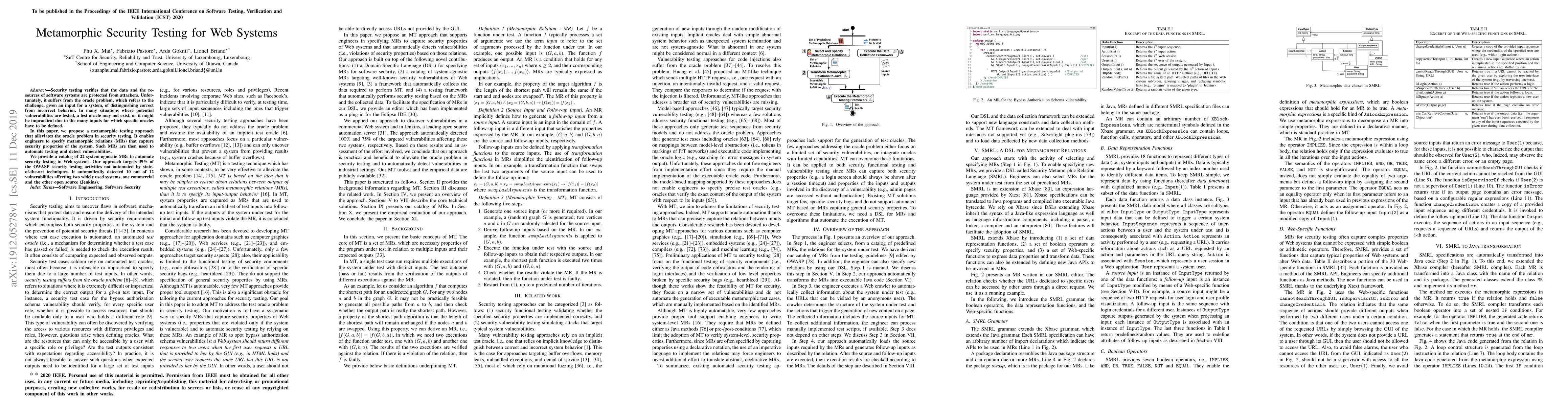 This paper proposes a metamorphic testing approach to address the oracle problem in security testing for web systems, enabling automated detection of vulnerabilities by specifying metamorphic relations that capture security properties. The method successfully detected 10 out of 12 vulnerabilities in two widely used systems, targeting 39% of OWASP security testing activities not covered by existing techniques.