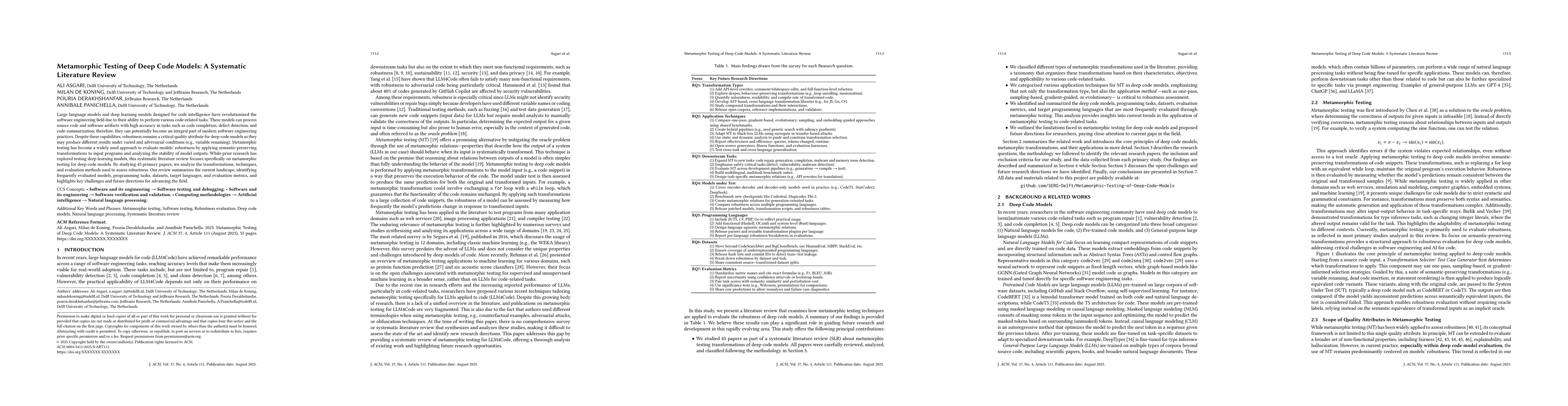 The research employs a systematic literature review focusing on metamorphic testing of deep code models, analyzing 45 primary studies to summarize transformations, techniques, and evaluation methods for assessing robustness.