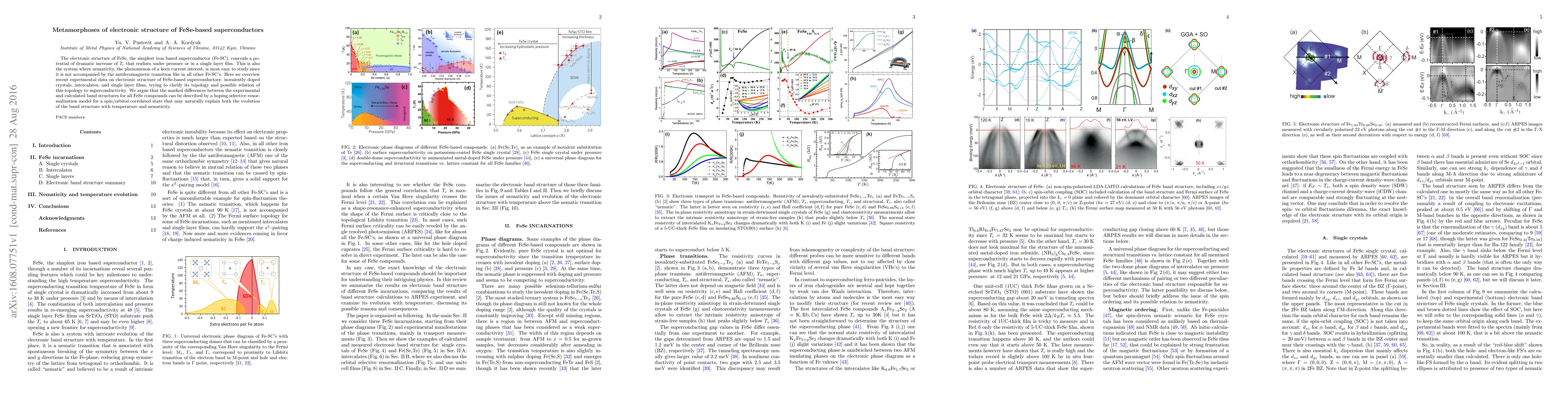 The electronic structure of FeSe, the simplest iron based superconductor (Fe-SC), conceals a potential of dramatic increase of Tc that realizes under pressure or in a single layer film. This is also the system where nematicity, the phenomenon of a keen current interest, is most easy to study since it is not accompanied by the antiferomagnetic transition like in all other Fe-SC's. Here we overview recent experimental data on electronic structure of FeSe-based superconductors: isovalently doped crystals, intercalates, and single layer films, trying to clarify its topology and possible relation of this topology to superconductivity. We argue that the marked differences between the experimental and calculated band structures for all FeSe compounds can be described by a hoping selective renormalization model for a spin/orbital correlated state that may naturally explain both the evolution of the band structure with temperature and nematicity.