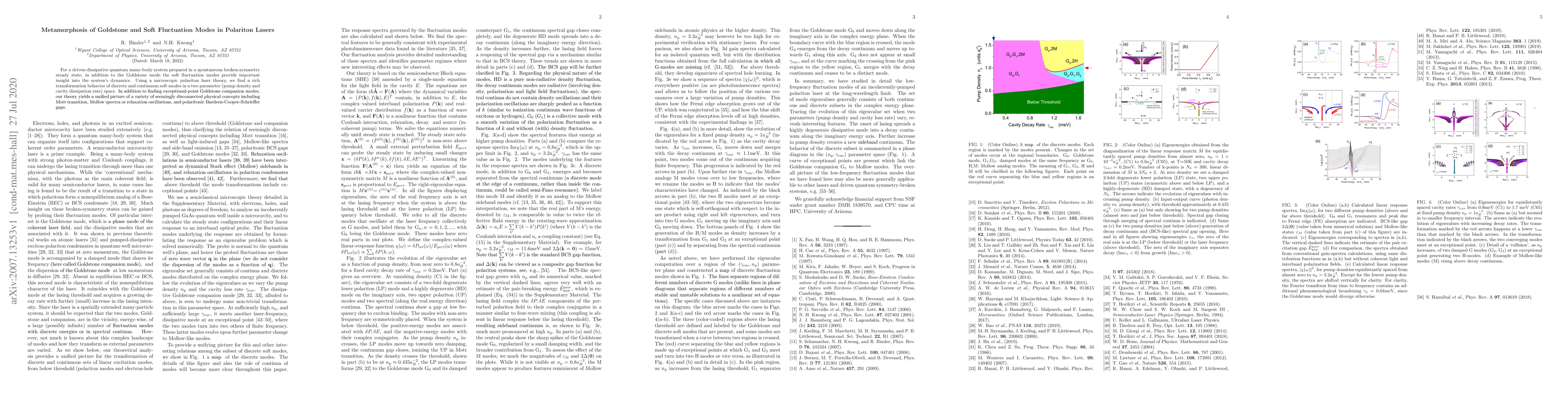 For a driven-dissipative quantum many-body system prepared in a spontaneous broken-symmetry steady state, in addition to the Goldstone mode the soft fluctuation modes provide important insight into the system's dynamics. Using a microscopic polariton laser theory, we find a rich transformation behavior of discrete and continuum soft modes in a two parameter (pump density and cavity dissipation rate) space. In addition to finding exceptional-point Goldstone companion modes, our theory yields a unified picture of a variety of seemingly disconnected physical concepts including Mott transition, Mollow spectra or relaxation oscillations, and polaritonic Bardeen-Cooper-Schrieffer gaps.