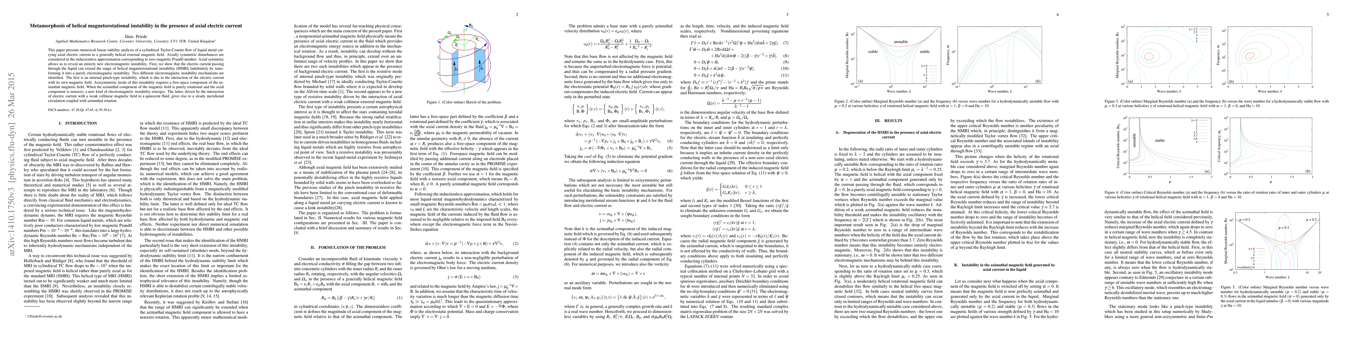 This paper investigates the helical magnetorotational instability in liquid metal flows with axial electric current, revealing a new electromagnetic instability that extends the range of HMRI. Two identified mechanisms include an internal pinch-type instability and a new meridional circulation-driven instability.