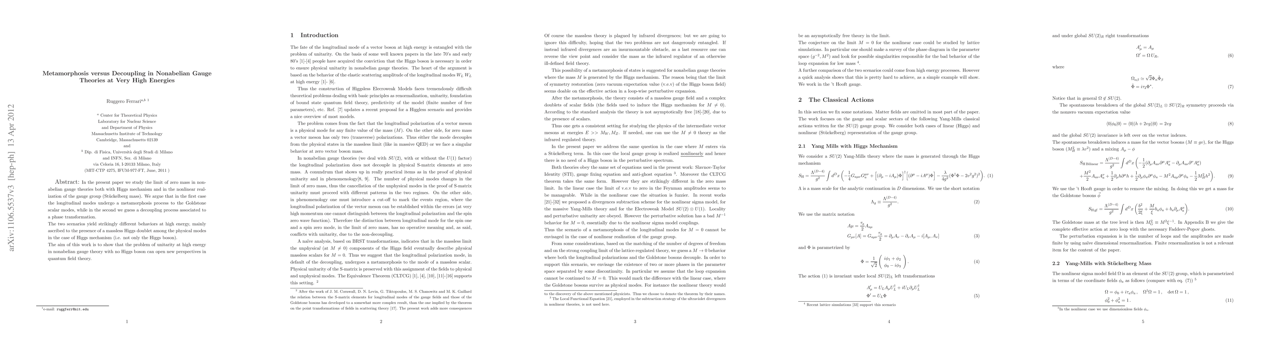 In the present paper we study the limit of zero mass in nonabelian gauge theories both with Higgs mechanism and in the nonlinear realization of the gauge group (Stueckelberg mass). We argue that in the first case the longitudinal modes undergo a metamorphosis process to the Goldstone scalar modes, while in the second we guess a decoupling process associated to a phase transformation. The two scenarios yield strikingly different behaviors at high energy, mainly ascribed to the presence of a massless Higgs doublet among the physical modes in the case of Higgs mechanism (i.e. not only the Higgs boson). The aim of this work is to show that the problem of unitarity at high energy in nonabelian gauge theory with no Higgs boson can open new perspectives in quantum field theory.