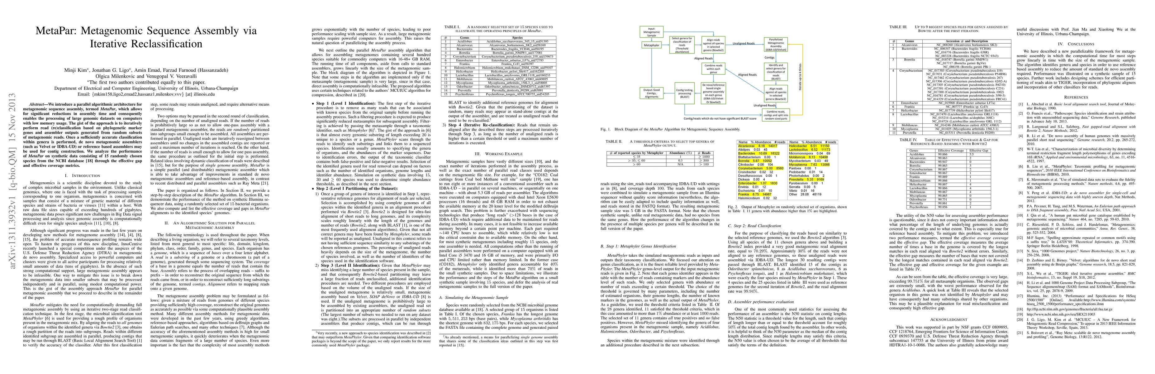 MetaPar is a parallel algorithmic architecture for metagenomic sequence assembly that reduces assembly time and enables processing of large datasets on low-memory computers. It iteratively reclassifies reads based on phylogenetic markers and assembles subsets of reads, followed by de novo or reference-based assembly for contig construction.