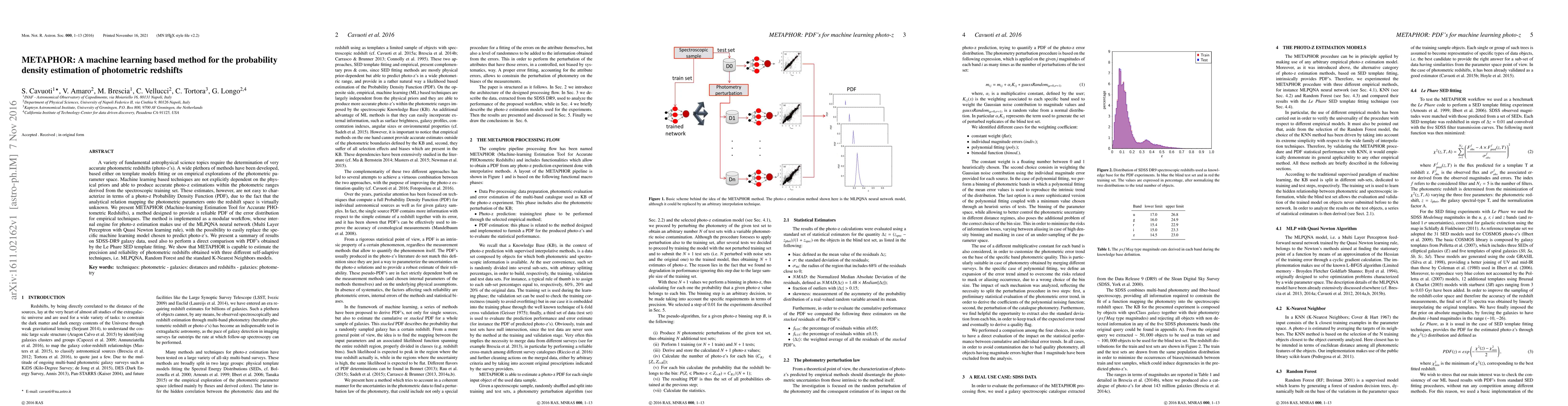 METAPHOR is a machine learning method for estimating the probability density function of photometric redshifts, utilizing the MLPQNA neural network. It provides reliable error distribution estimates for various self-adaptive techniques, outperforming traditional template fitting methods like Le Phare.