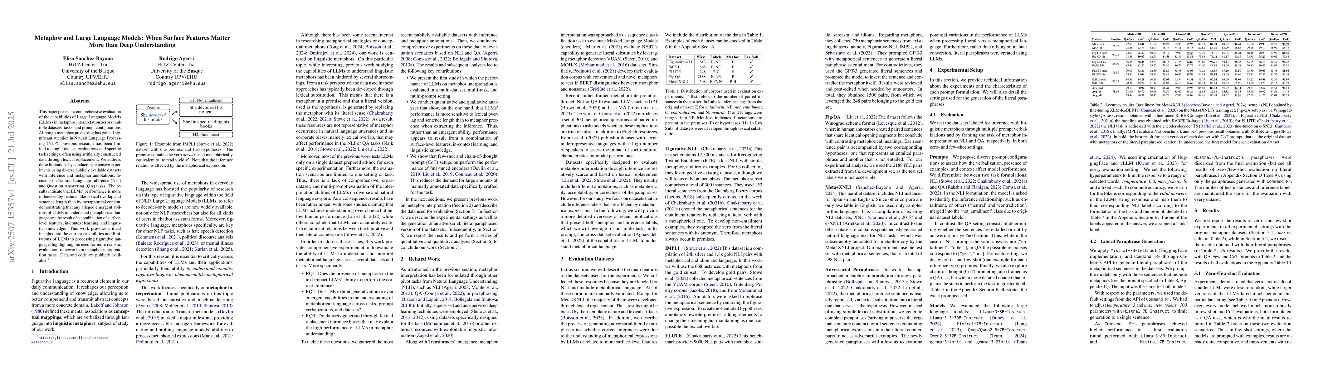 This paper presents a comprehensive evaluation of the capabilities of Large Language Models (LLMs) in metaphor interpretation across multiple datasets, tasks, and prompt configurations. Although metaphor processing has gained significant attention in Natural Language Processing (NLP), previous research has been limited to single-dataset evaluations and specific task settings, often using artificially constructed data through lexical replacement. We address these limitations by conducting extensive experiments using diverse publicly available datasets with inference and metaphor annotations, focusing on Natural Language Inference (NLI) and Question Answering (QA) tasks. The results indicate that LLMs' performance is more influenced by features like lexical overlap and sentence length than by metaphorical content, demonstrating that any alleged emergent abilities of LLMs to understand metaphorical language are the result of a combination of surface-level features, in-context learning, and linguistic knowledge. This work provides critical insights into the current capabilities and limitations of LLMs in processing figurative language, highlighting the need for more realistic evaluation frameworks in metaphor interpretation tasks. Data and code are publicly available.