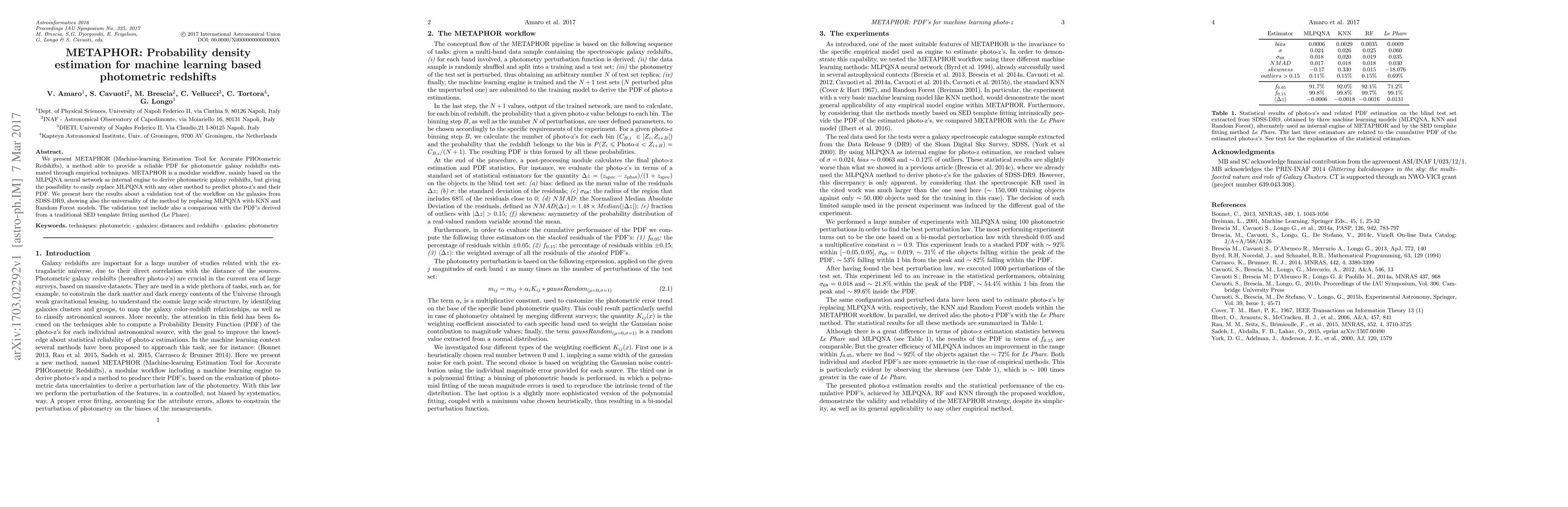 METAPHOR is a machine learning tool for estimating photometric galaxy redshifts, providing a reliable probability density function (PDF) through an MLPQNA neural network. The method was validated on SDSS-DR9 data and demonstrated universality by substituting MLPQNA with KNN and Random Forest models, showing comparable results to traditional SED fitting methods.