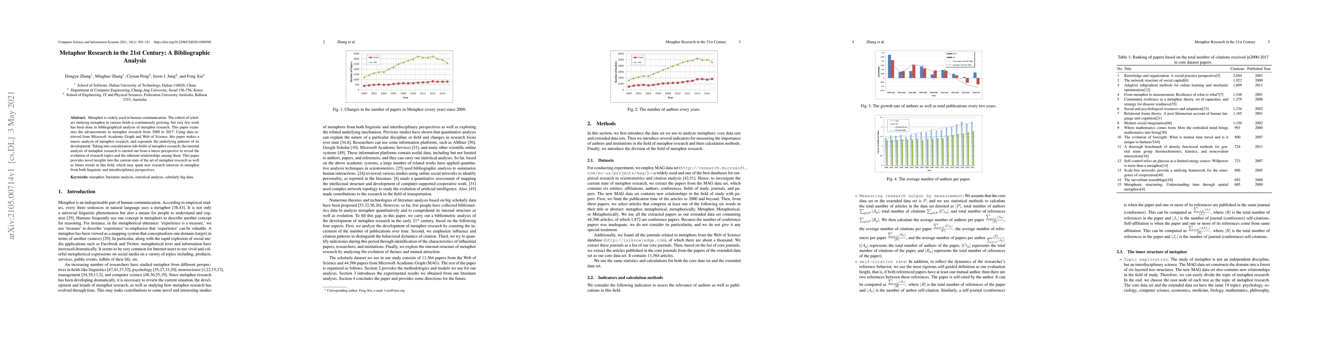 Metaphor is widely used in human communication. The cohort of scholars studying metaphor in various fields is continuously growing, but very few work has been done in bibliographical analysis of metaphor research. This paper examines the advancements in metaphor research from 2000 to 2017. Using data retrieved from Microsoft Academic Graph and Web of Science, this paper makes a macro analysis of metaphor research, and expounds the underlying patterns of its development. Taking into consideration sub-fields of metaphor research, the internal analysis of metaphor research is carried out from a micro perspective to reveal the evolution of research topics and the inherent relationships among them. This paper provides novel insights into the current state of the art of metaphor research as well as future trends in this field, which may spark new research interests in metaphor from both linguistic and interdisciplinary perspectives.