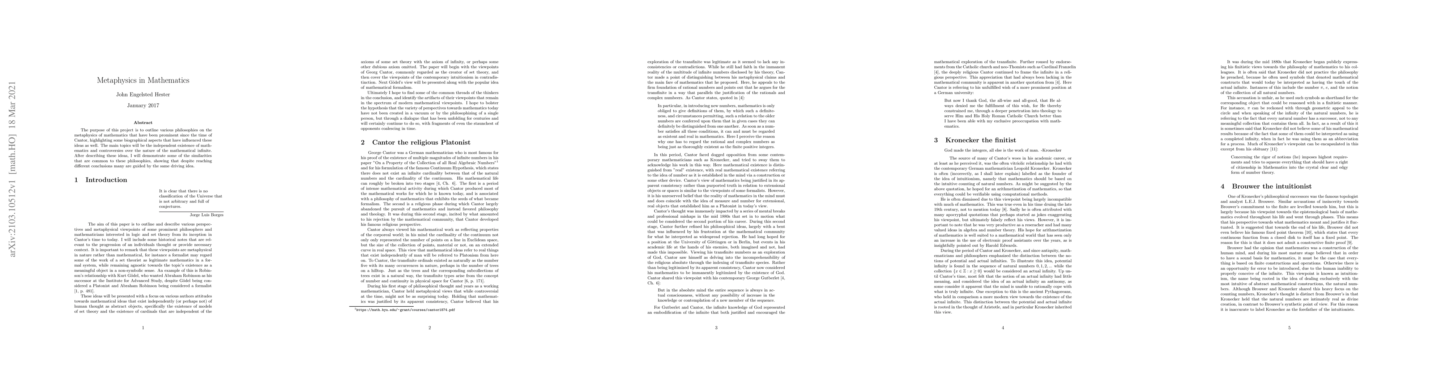 The purpose of this project is to outline various philosophies on the metaphysics of mathematics that have been prominent since the time of Cantor, highlighting some biographical aspects that have influenced these ideas as well. The main topics will be the independent existence of mathematics and controversies over the nature of the mathematical infinite. After describing these ideas, I will demonstrate some of the similarities that are common to these philosophies, showing that despite reaching different conclusions many are guided by the same driving idea.