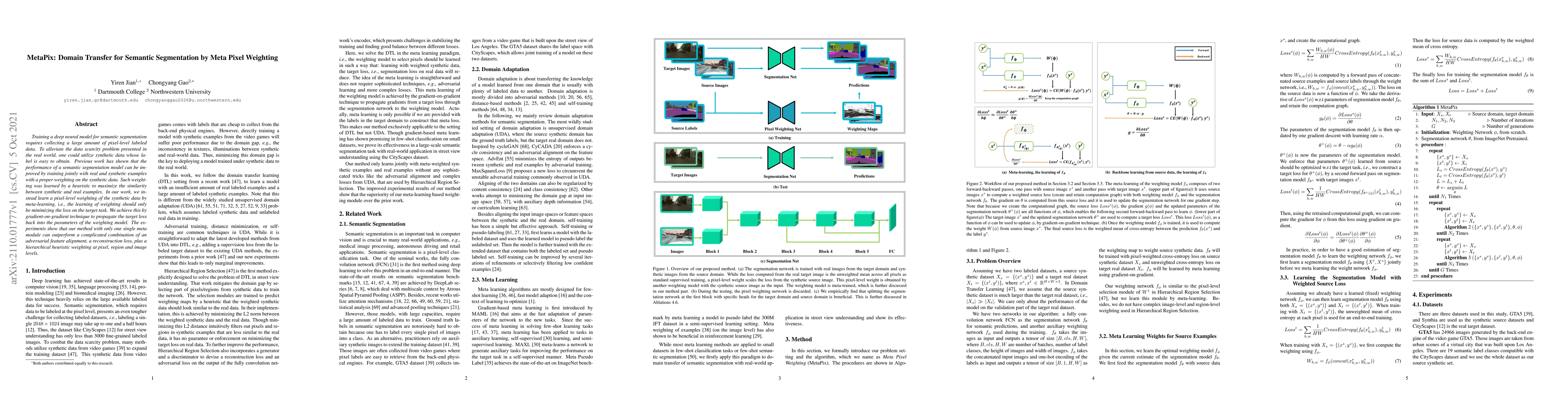 Training a deep neural model for semantic segmentation requires collecting a large amount of pixel-level labeled data. To alleviate the data scarcity problem presented in the real world, one could utilize synthetic data whose label is easy to obtain. Previous work has shown that the performance of a semantic segmentation model can be improved by training jointly with real and synthetic examples with a proper weighting on the synthetic data. Such weighting was learned by a heuristic to maximize the similarity between synthetic and real examples. In our work, we instead learn a pixel-level weighting of the synthetic data by meta-learning, i.e., the learning of weighting should only be minimizing the loss on the target task. We achieve this by gradient-on-gradient technique to propagate the target loss back into the parameters of the weighting model. The experiments show that our method with only one single meta module can outperform a complicated combination of an adversarial feature alignment, a reconstruction loss, plus a hierarchical heuristic weighting at pixel, region and image levels.