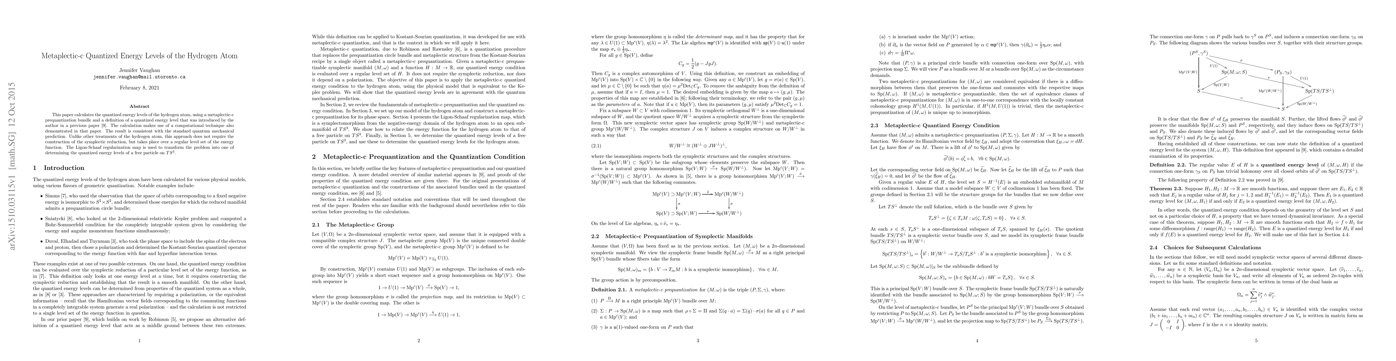 The paper calculates quantized energy levels of the hydrogen atom using a metaplectic-c prequantization bundle, without constructing symplectic reduction, and transforms the problem into one of determining quantized energy levels of a free particle on the tangent bundle for S^3.