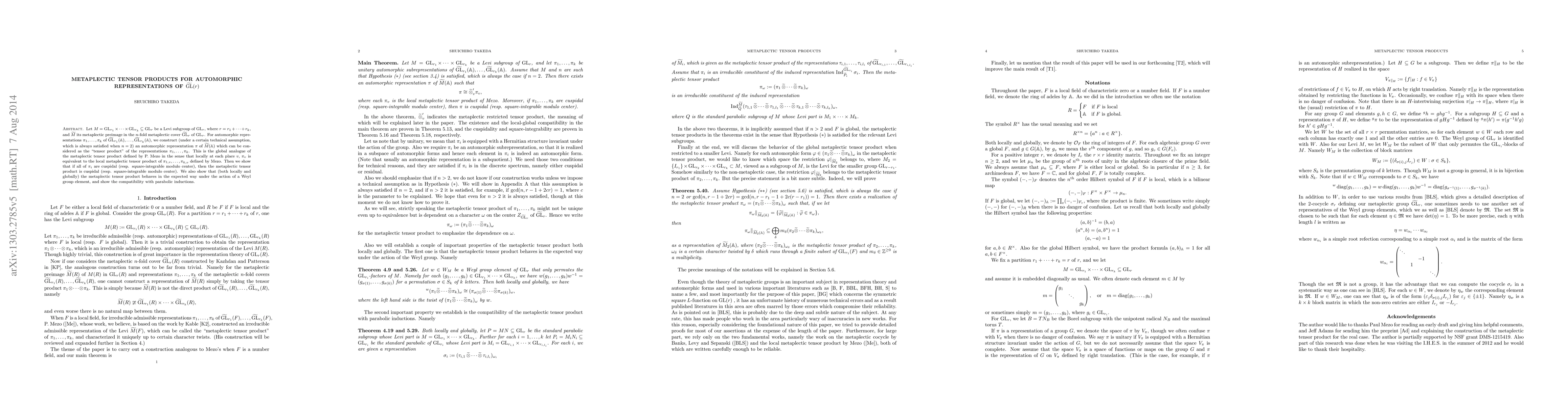 This paper constructs a global metaplectic tensor product for automorphic representations of $\tilde{M}$, a metaplectic preimage of a Levi subgroup $M$ in $GL_r$. It demonstrates that this tensor product preserves cuspidality and square-integrability modulo the center, and behaves predictably under Weyl group actions and parabolic inductions.