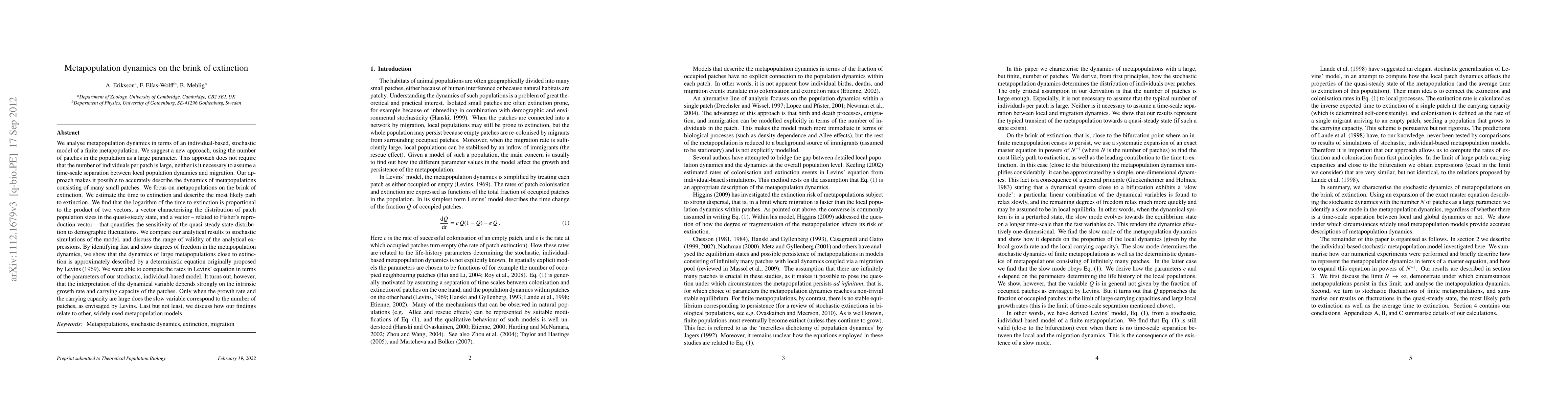 We analyse metapopulation dynamics in terms of an individual-based, stochastic model of a finite metapopulation. We suggest a new approach, using the number of patches in the population as a large parameter. This approach does not require that the number of individuals per patch is large, neither is it necessary to assume a time-scale separation between local population dynamics and migration. Our approach makes it possible to accurately describe the dynamics of metapopulations consisting of many small patches. We focus on metapopulations on the brink of extinction. We estimate the time to extinction and describe the most likely path to extinction. We find that the logarithm of the time to extinction is proportional to the product of two vectors, a vector characterising the distribution of patch population sizes in the quasi-steady state, and a vector -- related to Fisher's reproduction vector -- that quantifies the sensitivity of the quasi-steady state distribution to demographic fluctuations. We compare our analytical results to stochastic simulations of the model, and discuss the range of validity of the analytical expressions. By identifying fast and slow degrees of freedom in the metapopulation dynamics, we show that the dynamics of large metapopulations close to extinction is approximately described by a deterministic equation originally proposed by Levins (1969). We were able to compute the rates in Levins' equation in terms of the parameters of our stochastic, individual-based model. It turns out, however, that the interpretation of the dynamical variable depends strongly on the intrinsic growth rate and carrying capacity of the patches. Only when the growth rate and the carrying capacity are large does the slow variable correspond to the number of patches, as envisaged by Levins. Last but not least, we discuss how our findings relate to other, widely used metapopulation models.