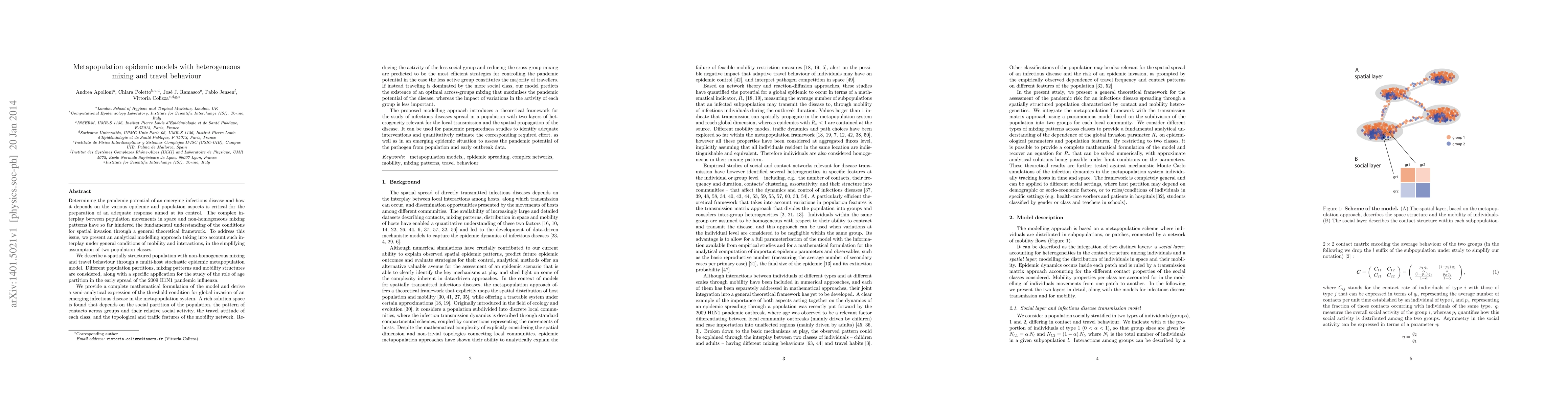 The complex interplay between population movements in space and non-homogeneous mixing patterns have so far hindered the fundamental understanding of the conditions for spatial invasion through a general theoretical framework. To address this issue, we present an analytical modelling approach taking into account such interplay under general conditions of mobility and interactions, in the simplifying assumption of two population classes. We describe a spatially structured population with non-homogeneous mixing and travel behaviour through a multi-host stochastic epidemic metapopulation model. Different population partitions, mixing patterns and mobility structures are considered, along with a specific application for the study of the role of age partition in the early spread of the 2009 H1N1 pandemic influenza. We provide a complete mathematical formulation of the model and derive a semi-analytical expression of the threshold condition for global invasion of an emerging infectious disease in the metapopulation system. A rich solution space is found that depends on the social partition of the population, the pattern of contacts across groups and their relative social activity, the travel attitude of each class, and the topological and traffic features of the mobility network. Reducing the activity of the less social group and reducing the cross-group mixing are predicted to be the most efficient strategies for controlling the pandemic potential in the case the less active group constitutes the majority of travellers. If instead traveling is dominated by the more social class, our model predicts the existence of an optimal across-groups mixing that maximises the pandemic potential of the disease, whereas the impact of variations in the activity of each group is less important.
