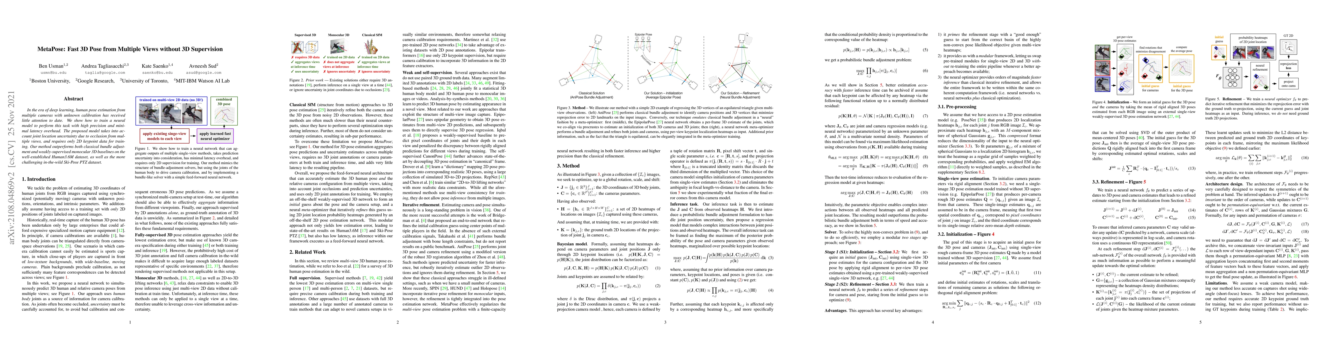 MetaPose presents a neural model for precise 3D human pose estimation from multiple uncalibrated cameras using only 2D keypoint data. It outperforms traditional and monocular 3D baselines on Human3.6M and Ski-Pose PTZ datasets.