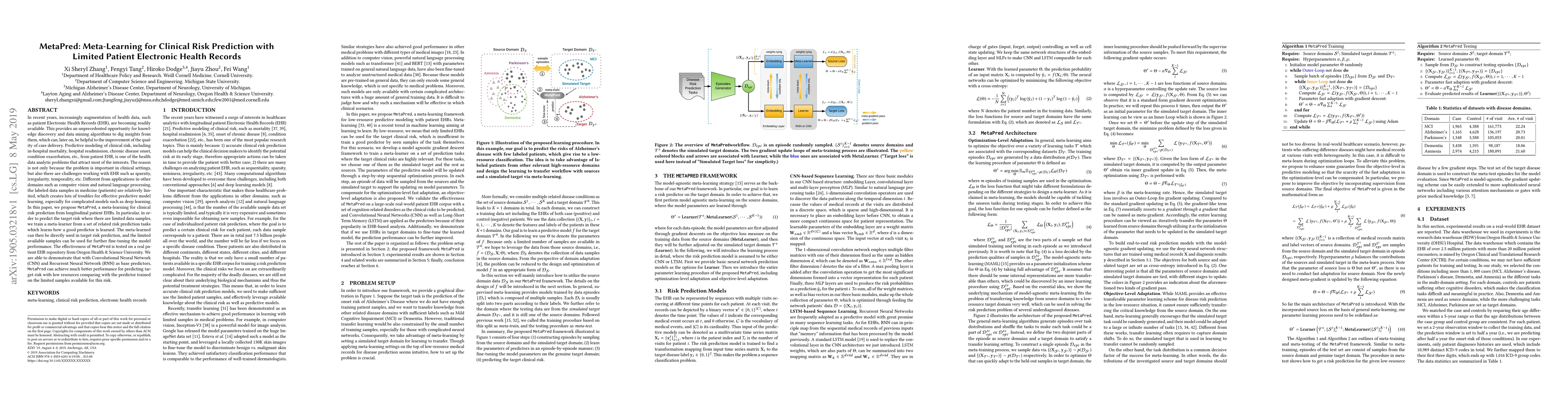 MetaPred is a meta-learning approach designed for clinical risk prediction using limited patient Electronic Health Records (EHR). It trains a meta-learner from related risk prediction tasks to effectively predict clinical risks like mortality and readmission, achieving better performance with fewer samples compared to traditional models.