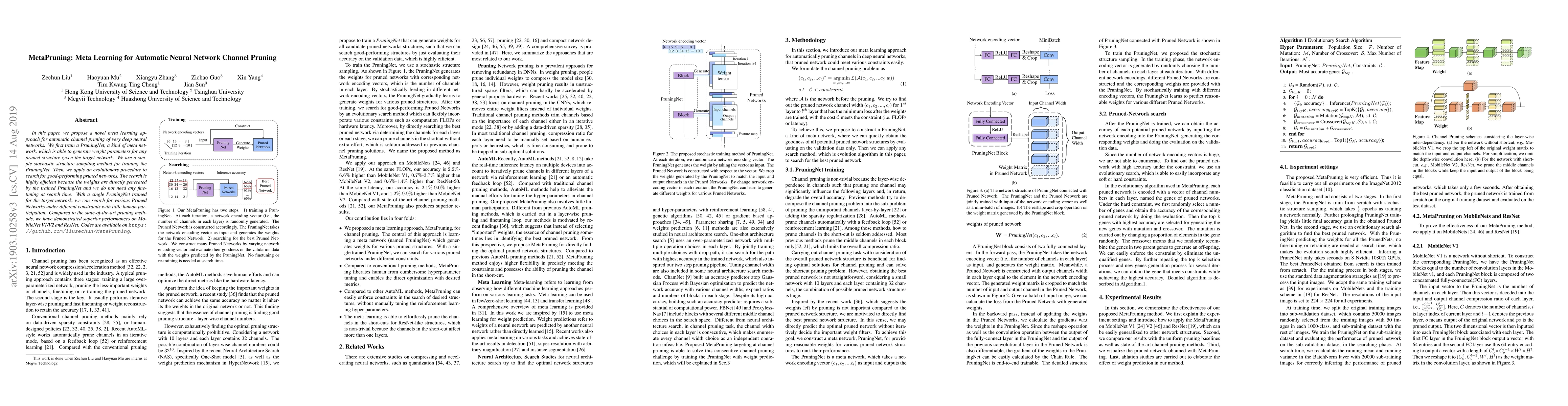 MetaPruning introduces a novel meta-learning approach for neural network pruning, combining a PruningNet with an efficient evolutionary search to automatically generate high-performing pruned networks under various constraints.