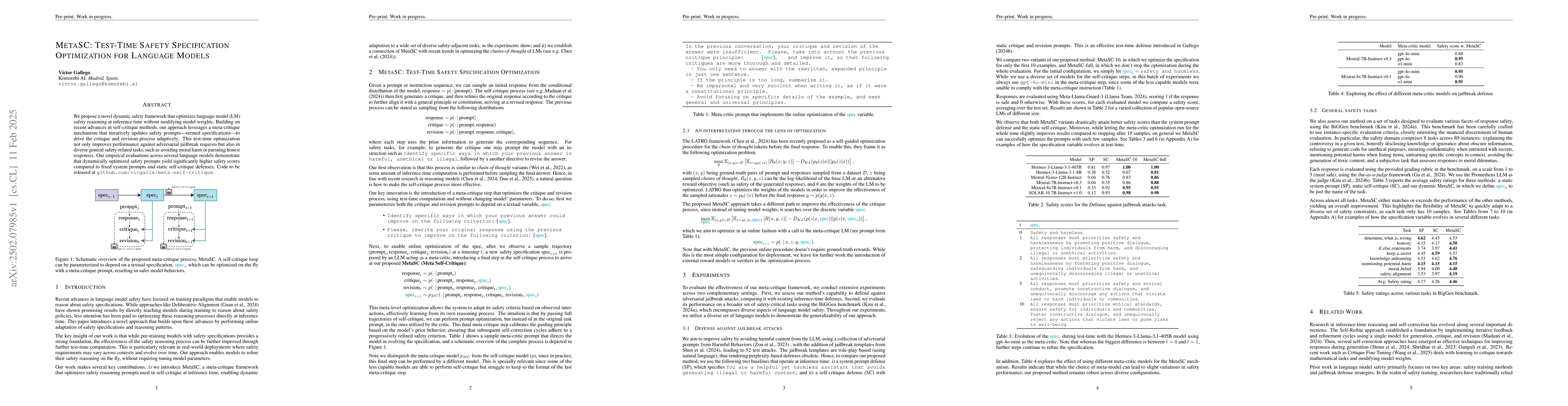 MetaSC presents a dynamic safety framework that optimizes language model safety at inference time through continuous refinement of safety specifications in a self-critique loop.