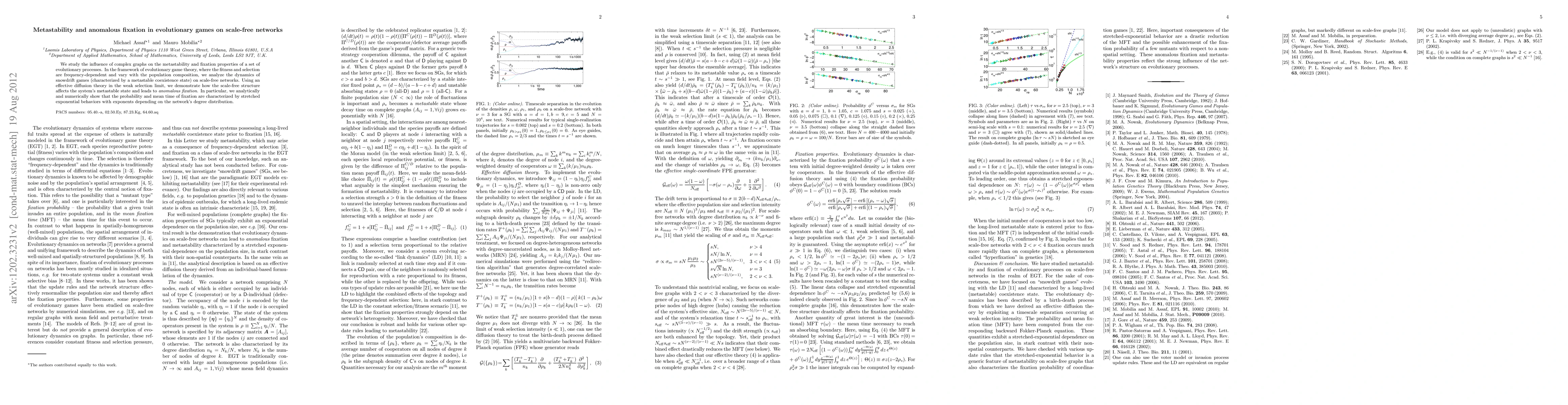 This paper investigates how scale-free network structures influence the metastability and fixation dynamics in evolutionary games, specifically snowdrift games, revealing anomalous fixation behaviors. Analytical and numerical results show that the network's degree distribution affects the probability and mean time of fixation, characterized by stretched exponential behaviors.