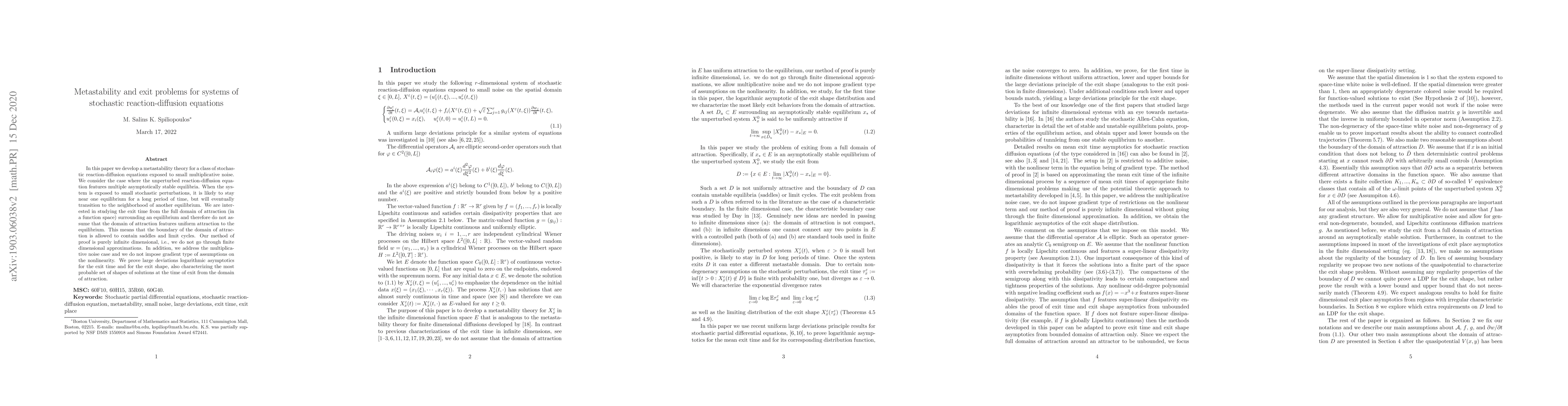The paper presents a metastability theory for stochastic reaction-diffusion equations with small multiplicative noise, proving large deviations principles for exit time and exit shape without resorting to finite-dimensional approximations or gradient assumptions on the nonlinearity.