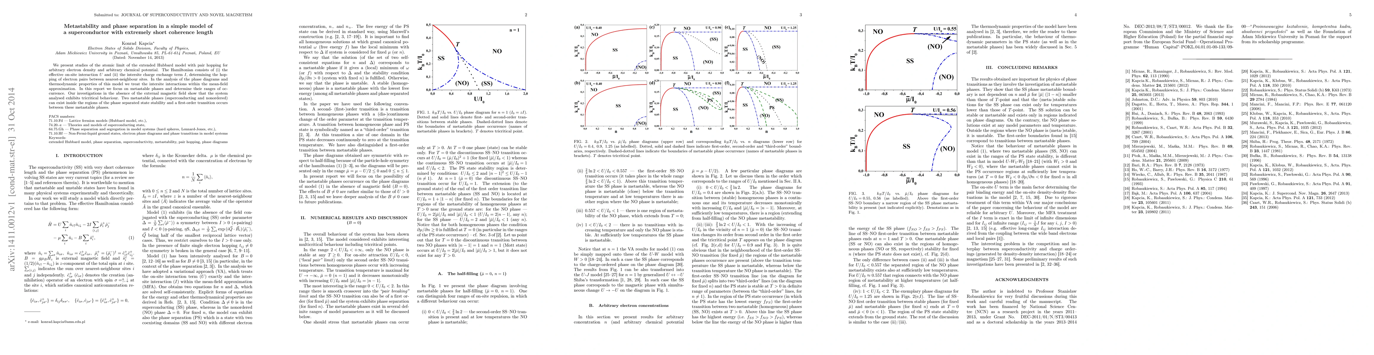 We present studies of the atomic limit of the extended Hubbard model with pair hopping for arbitrary electron density and arbitrary chemical potential. The Hamiltonian consists of (i) the effective on-site interaction $U$ and (ii) the intersite charge exchange term $I$, determining the hopping of electron pairs between nearest-neighbour sites. In the analysis of the phase diagrams and thermodynamic properties of this model we treat the intersite interactions within the mean-field approximation. In this report we focus on metastable phases and determine their ranges of occurrence. Our investigations in the absence of the external magnetic field show that the system analysed exhibits tricritical behaviour. Two metastable phases (superconducting and nonordered) can exist inside the regions of the phase separated state stability and a first-order transition occurs between these metastable phases.