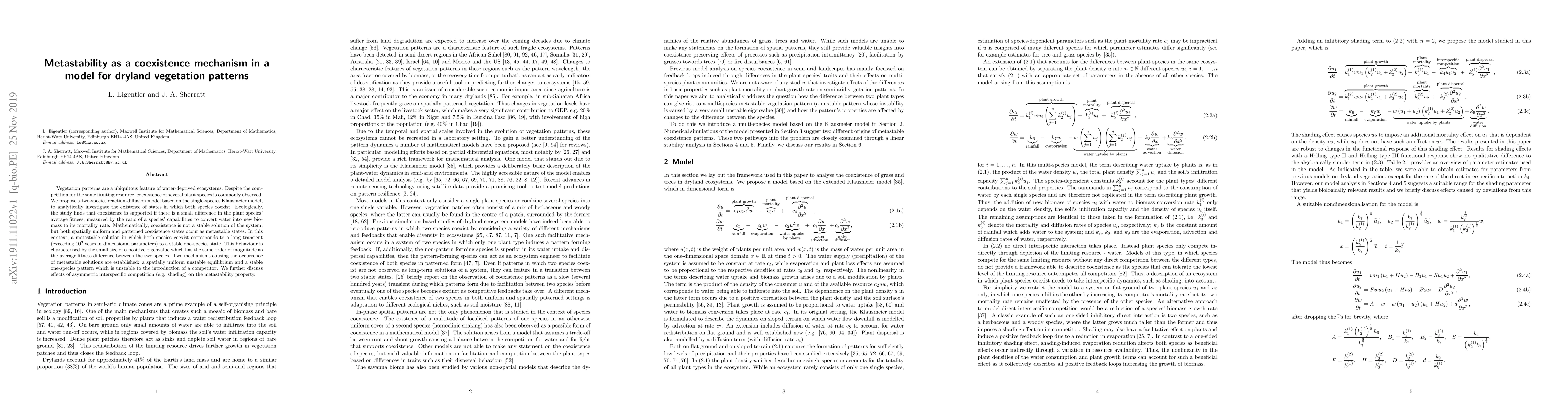 This paper proposes a two-species reaction-diffusion model to investigate coexistence in dryland vegetation patterns, finding that metastable states allow for coexistence despite competition. Coexistence is characterized by a small fitness difference and is not stable but occurs as a long-term transient to a stable one-species state.
