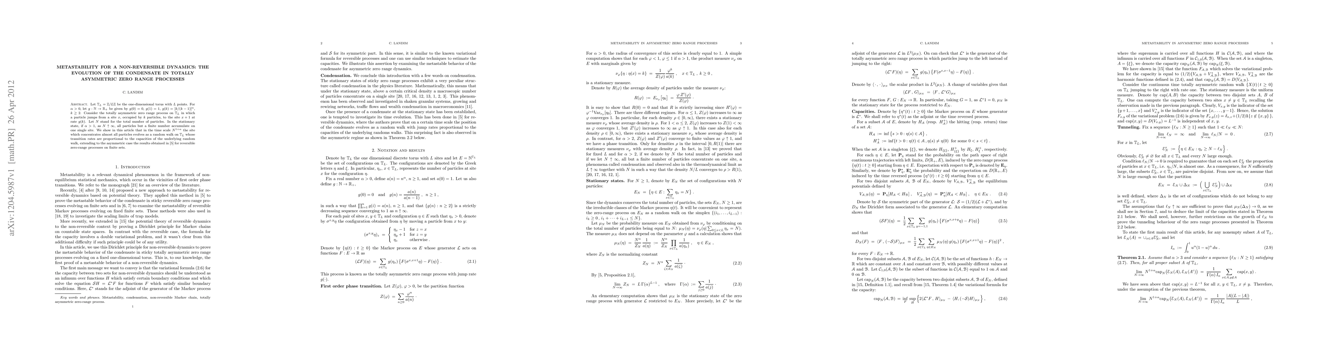 This paper investigates the metastability of a totally asymmetric zero range process on a one-dimensional torus, showing that for $\alpha > 1$, particles concentrate on a single site. The evolution of this site over the time scale $N^{1+\alpha}$ behaves like a random walk with transition rates proportional to the capacities of the underlying random walk, extending previous results for reversible processes.