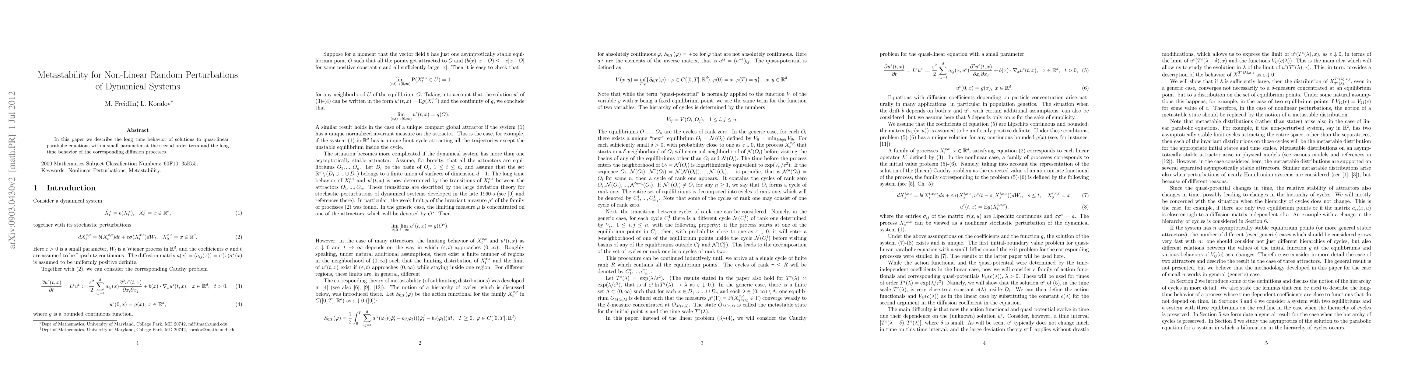 In this paper we describe the long time behavior of solutions to quasi-linear parabolic equations with a small parameter at the second order term and the long time behavior of corresponding diffusion processes.