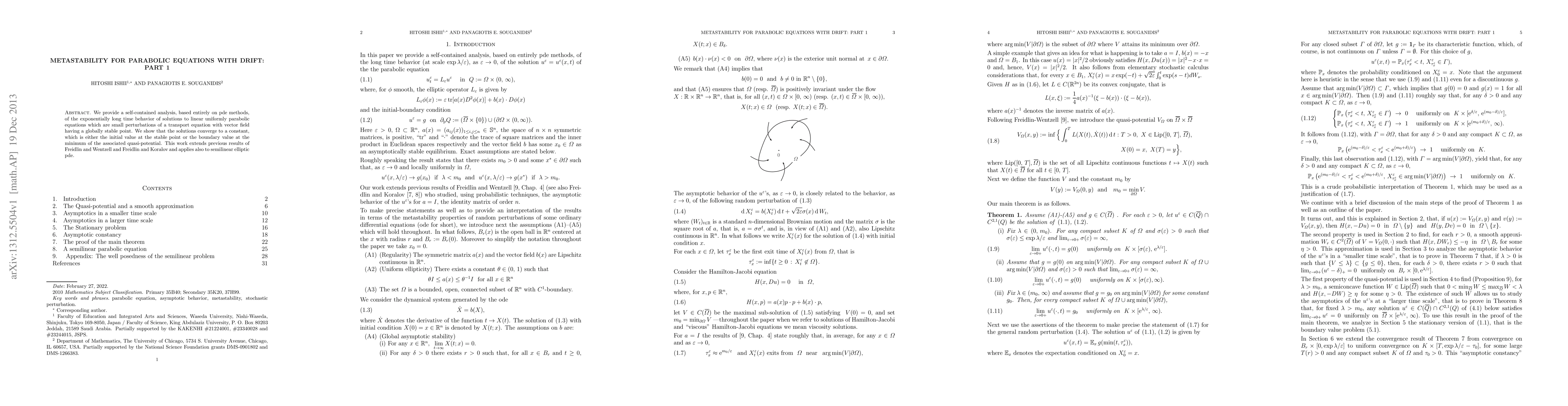 We provide a self-contained analysis, based entirely on pde methods, of the exponentially long time behavior of solutions to linear uniformly parabolic equations which are small perturbations of a transport equation with vector field having a globally stable point. We show that the solutions converge to a constant, which is either the initial value at the stable point or the boundary value at the minimum of the associated quasi-potential. This work extends previous results of Freidlin and Wentzell and Freidlin and Koralov and applies also to semilinear elliptic pde.