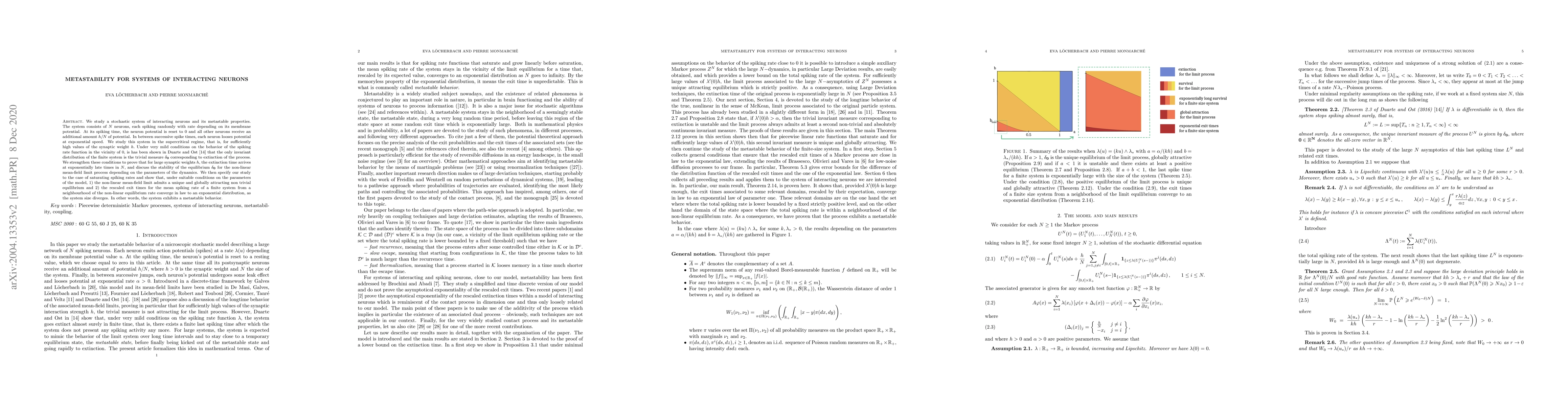 A stochastic system of interacting neurons exhibits metastable behavior under certain conditions, with an exponentially late extinction time for the trivial measure corresponding to equilibrium state.