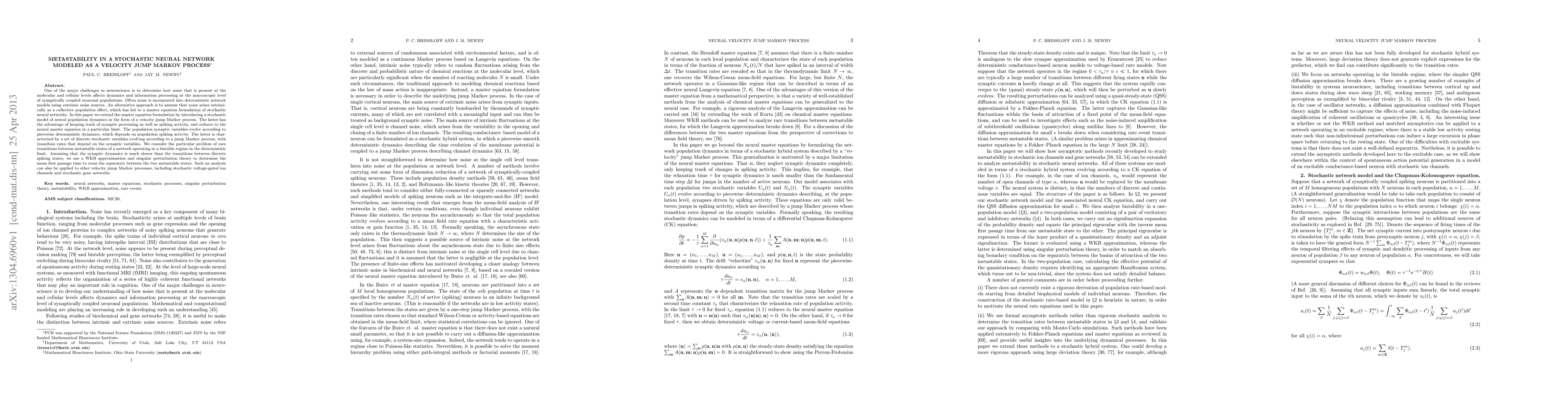 One of the major challenges in neuroscience is to determine how noise that is present at the molecular and cellular levels affects dynamics and information processing at the macroscopic level of synaptically coupled neuronal populations. Often noise is incorprated into deterministic network models using extrinsic noise sources. An alternative approach is to assume that noise arises intrinsically as a collective population effect, which has led to a master equation formulation of stochastic neural networks. In this paper we extend the master equation formulation by introducing a stochastic model of neural population dynamics in the form of a velocity jump Markov process. The latter has the advantage of keeping track of synaptic processing as well as spiking activity, and reduces to the neural master equation in a particular limit. The population synaptic variables evolve according to piecewise deterministic dynamics, which depends on population spiking activity. The latter is characterised by a set of discrete stochastic variables evolving according to a jump Markov process, with transition rates that depend on the synaptic variables. We consider the particular problem of rare transitions between metastable states of a network operating in a bistable regime in the deterministic limit. Assuming that the synaptic dynamics is much slower than the transitions between discrete spiking states, we use a WKB approximation and singular perturbation theory to determine the mean first passage time to cross the separatrix between the two metastable states. Such an analysis can also be applied to other velocity jump Markov processes, including stochastic voltage-gated ion channels and stochastic gene networks.