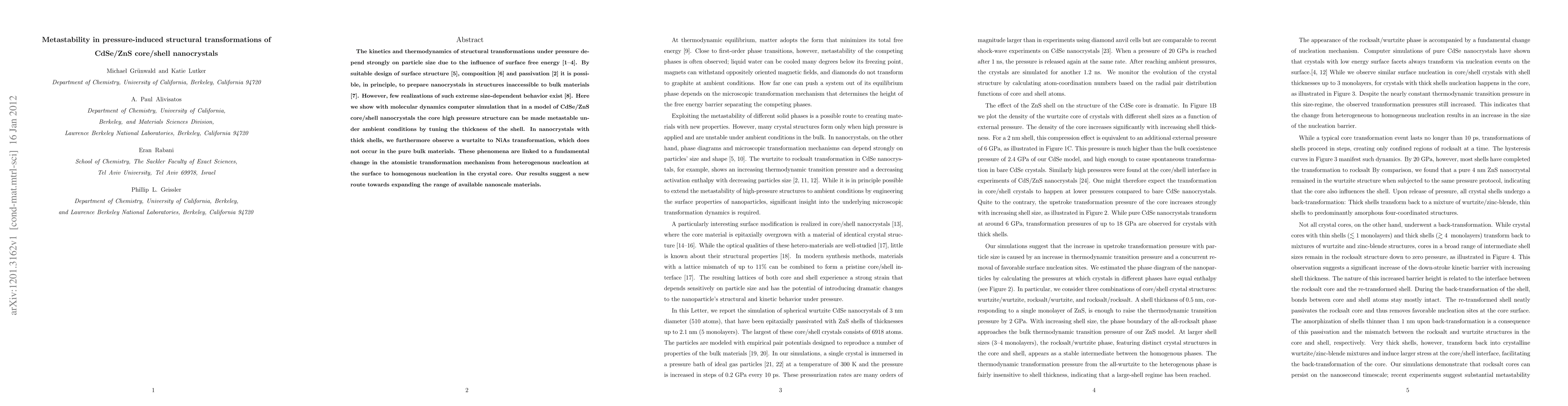 This study demonstrates that pressure-induced structural transformations in CdSe/ZnS core/shell nanocrystals can be made metastable under ambient conditions by adjusting the thickness of the ZnS shell. This leads to a wurtzite to NiAs transformation not observed in bulk materials, revealing a shift from surface-driven to core-driven nucleation mechanisms.