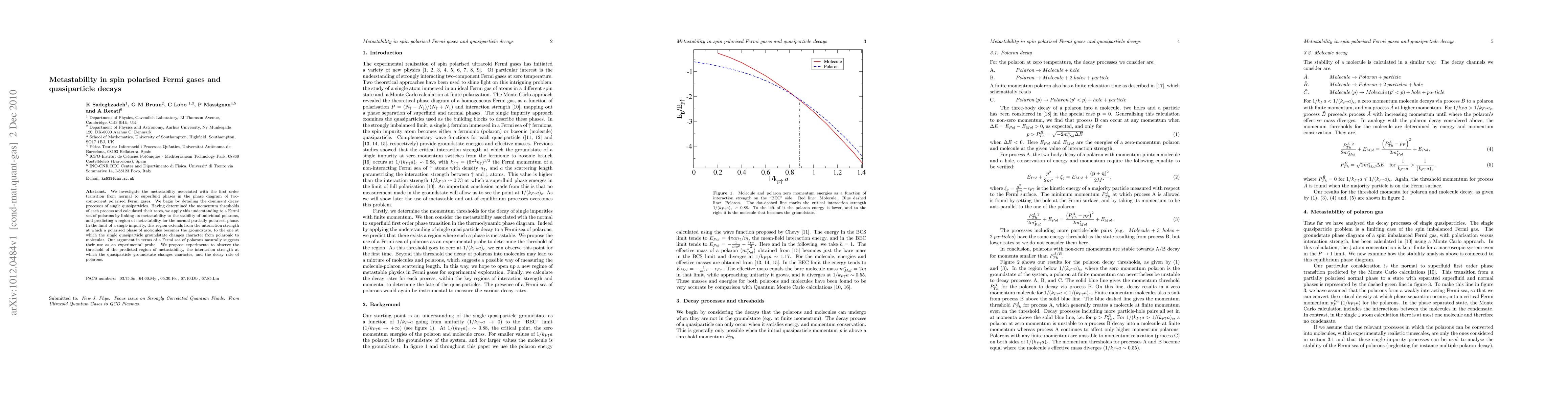 This paper explores the metastability of two-component polarized Fermi gases undergoing a first-order transition to a superfluid phase, focusing on the decay processes of single quasiparticles. The study predicts a metastable region for the normal partially polarized phase and suggests using polarons as experimental probes to observe these phenomena.