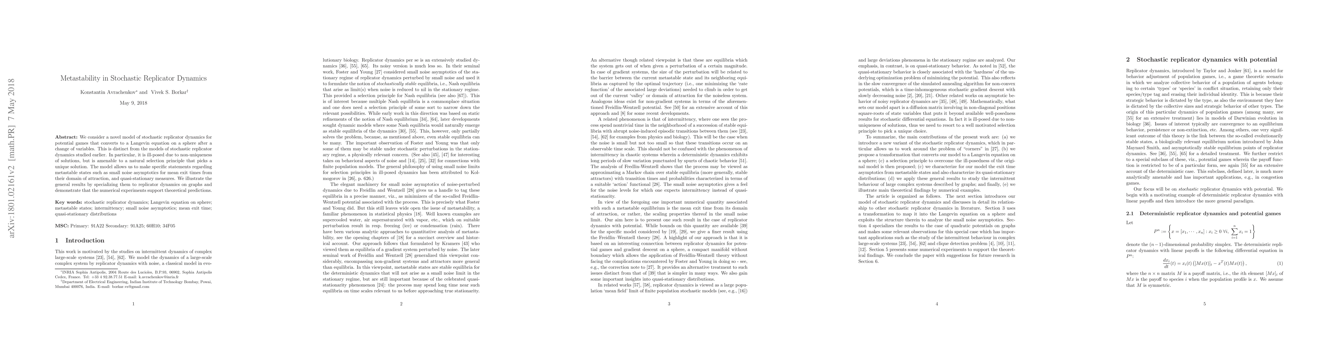 This paper introduces a novel stochastic replicator dynamics model for potential games, which converts to a Langevin equation on a sphere. Despite being ill-posed due to non-uniqueness, it adheres to a natural selection principle that selects a unique solution, allowing for analysis of metastable states and quasi-stationary measures, with numerical experiments corroborating theoretical predictions.