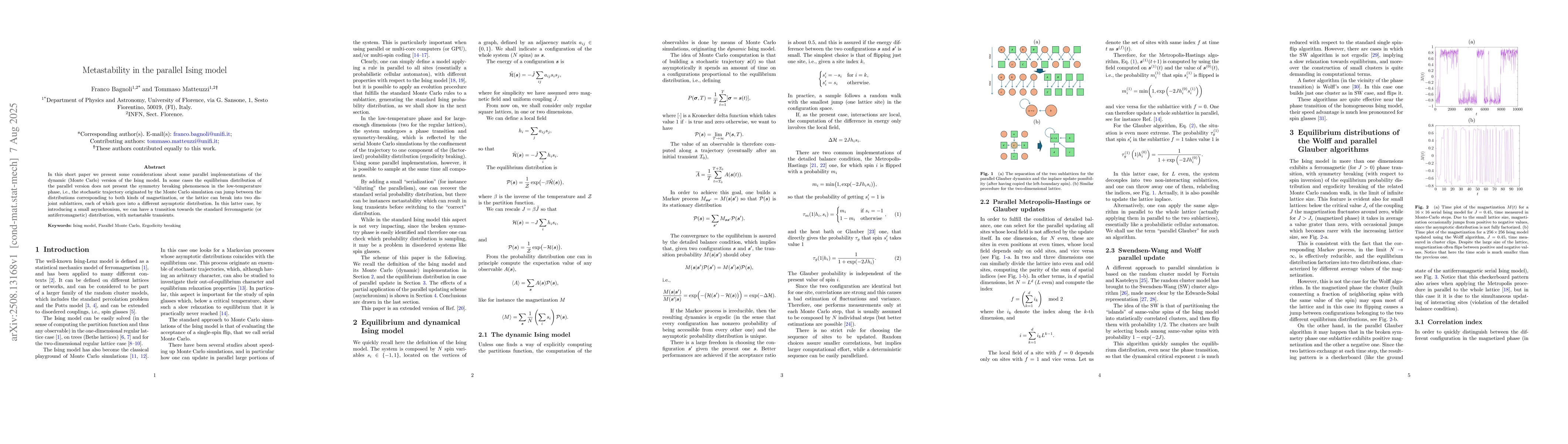 In this short paper we present some considerations about some parallel implementations of the dynamic (Monte Carlo) version of the Ising model. In some cases the equilibrium distribution of the parallel version does not present the symmetry breaking phenomenon in the low-temperature phase, i.e., the stochastic trajectory originated by the Monte Carlo simulation can jump between the distributions corresponding to both kinds of magnetization, or the lattice can break into two disjoint sublattices, each of which goes into a different asymptotic distribution. In this latter case, by introducing a small asynchronism, we can have a transition towards the standard ferromagnetic (or antiferromagnetic) distribution, with metastable transients.