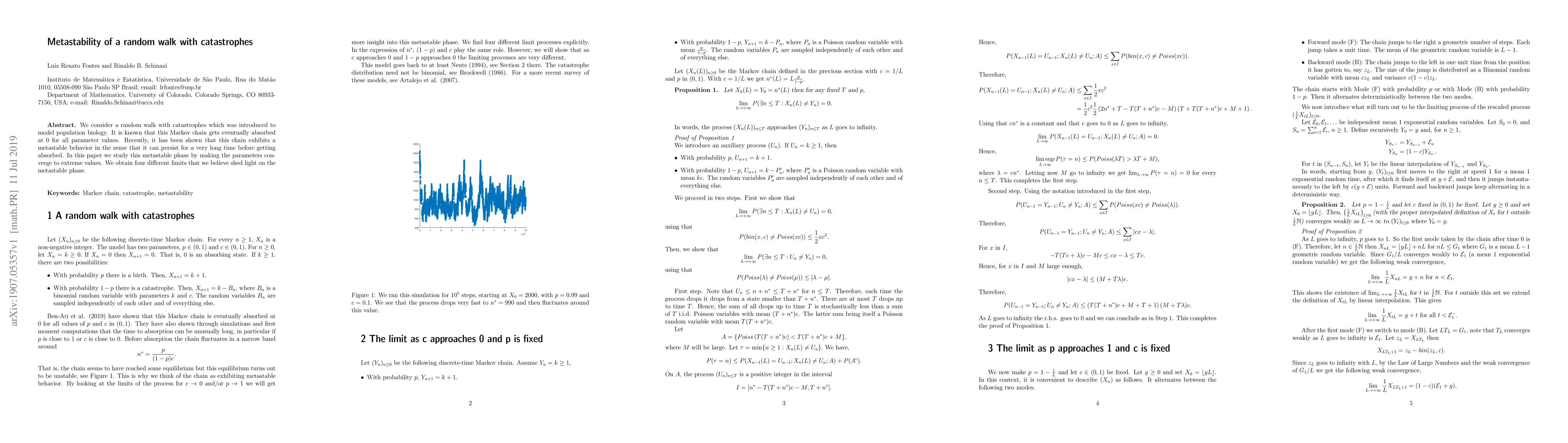 This paper investigates the metastable behavior of a random walk with catastrophes, a Markov chain used to model population biology, which eventually absorbs at zero. The authors explore how the chain persists for extended periods before absorption, analyzing four different limits as parameters converge to extreme values to better understand this metastable phase.