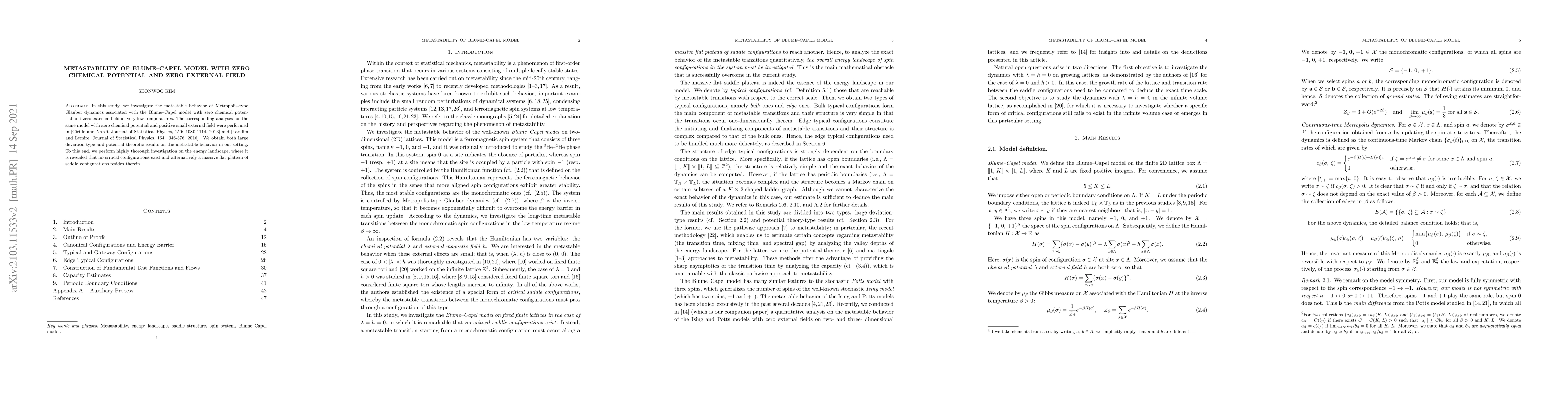 In this study, we investigate the metastable behavior of Metropolis-type Glauber dynamics associated with the Blume-Capel model with zero chemical potential and zero external field at very low temperatures. The corresponding analyses for the same model with zero chemical potential and positive small external field were performed in [Cirillo and Nardi, Journal of Statistical Physics, 150: 1080-1114, 2013] and [Landim and Lemire, Journal of Statistical Physics, 164: 346-376, 2016]. We obtain both large deviation-type and potential-theoretic results on the metastable behavior in our setting. To this end, we perform highly thorough investigation on the energy landscape, where it is revealed that no critical configurations exist and alternatively a massive flat plateau of saddle configurations resides therein.