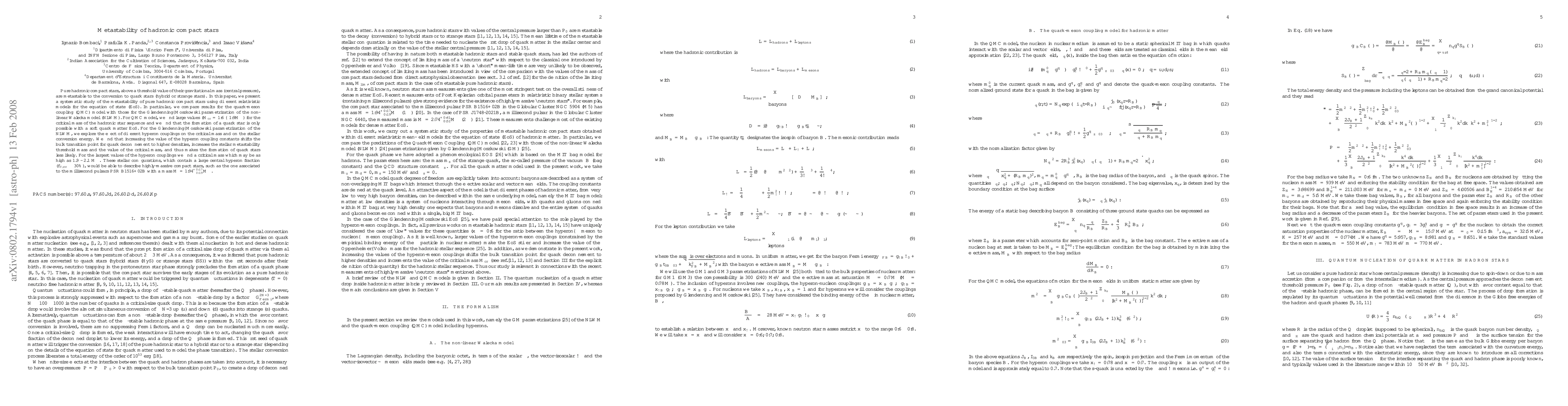 Pure hadronic compact stars, above a threshold value of their gravitational mass (central pressure), are metastable to the conversion to quark stars (hybrid or strange stars). In this paper, we present a systematic study of the metastability of pure hadronic compact stars using different relativistic models for the equation of state (EoS). In particular, we compare results for the quark-meson coupling (QMC) model with those for the Glendenning--Moszkowski parametrization of the non-linear Walecka model (NLWM). For QMC model, we find large values ($M_{cr} = 1.6$ -- $1.9 M_\odot$) for the critical mass of the hadronic star sequence and we find that the formation of a quark star is only possible with a soft quark matter EoS. For the Glendenning--Moszkowski parametrization of the NLWM, we explore the effect of different hyperon couplings on the critical mass and on the stellar conversion energy. We find that increasing the value of the hyperon coupling constants shifts the bulk transition point for quark deconfinement to higher densities, increases the stellar metastability threshold mass and the value of the critical mass, and thus makes the formation of quark stars less likely. For the largest values of the hyperon couplings we find a critical mass which may be as high as 1.9 - 2.1 $M_\odot$. These stellar configurations, which contain a large central hyperon fraction ($f_{Y,cr} \sim 30 %$), would be able to describe highly-massive compact stars, such as the one associated to the millisecond pulsars PSR B1516+02B with a mass $M = 1.94^{+ 0.17}_{- 0.19} M_{\odot}$.