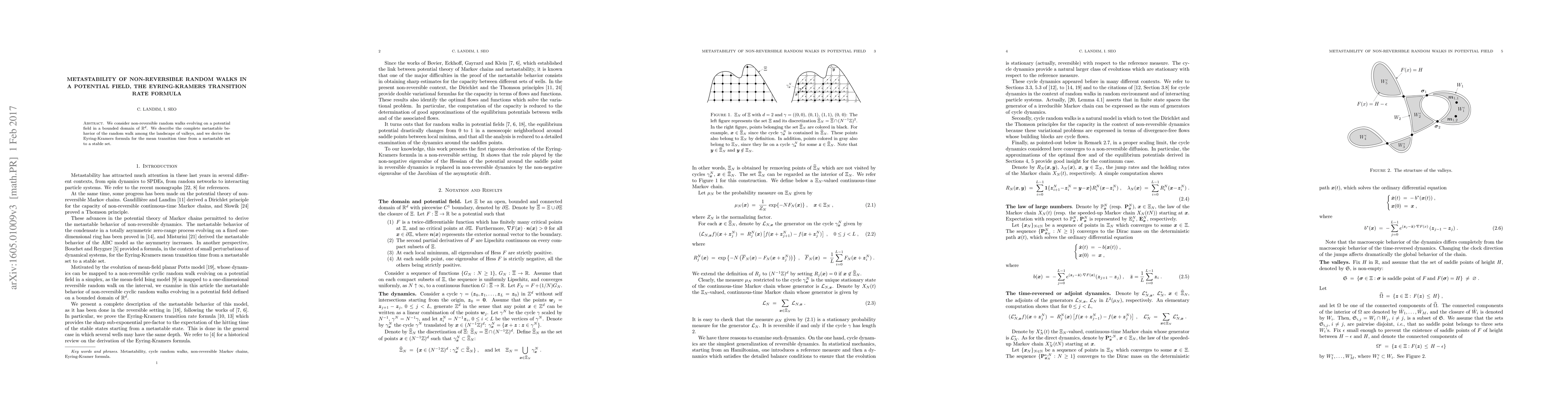This paper explores non-reversible random walks in a potential field, detailing their metastable behavior and deriving the Eyring-Kramers formula for the mean transition time from metastable to stable states.