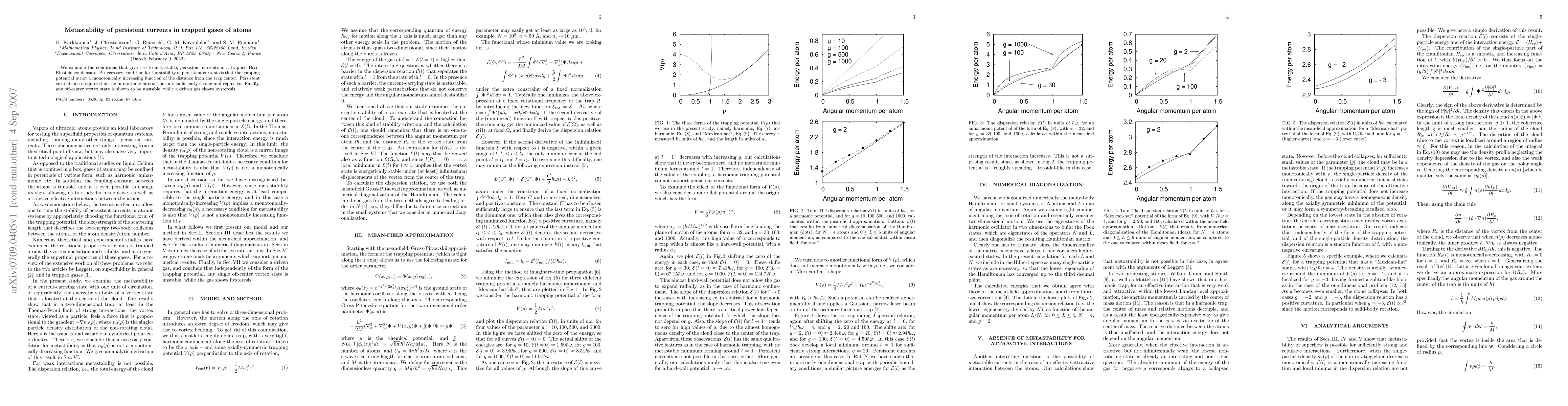 Researchers found that metastable persistent currents in trapped gases of atoms require a non-monotonic trapping potential and strong repulsive interatomic interactions. They also discovered that off-center vortex states are unstable and driven gases show hysteresis.