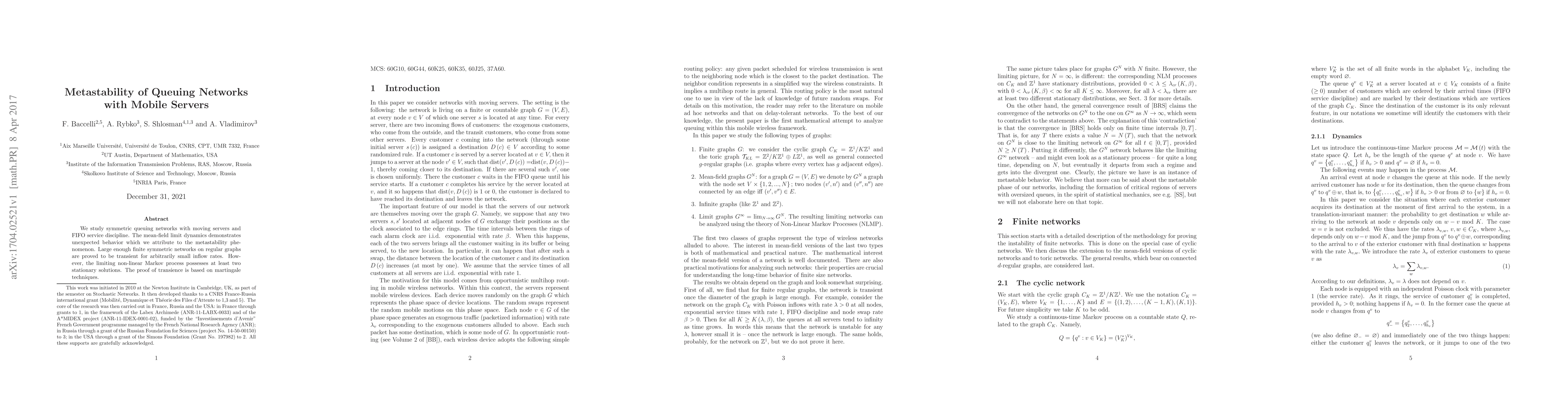 We study symmetric queuing networks with moving servers and FIFO service discipline. The mean-field limit dynamics demonstrates unexpected behavior which we attribute to the meta-stability phenomenon. Large enough finite symmetric networks on regular graphs are proved to be transient for arbitrarily small inflow rates. However, the limiting non-linear Markov process possesses at least two stationary solutions. The proof of transience is based on martingale techniques.