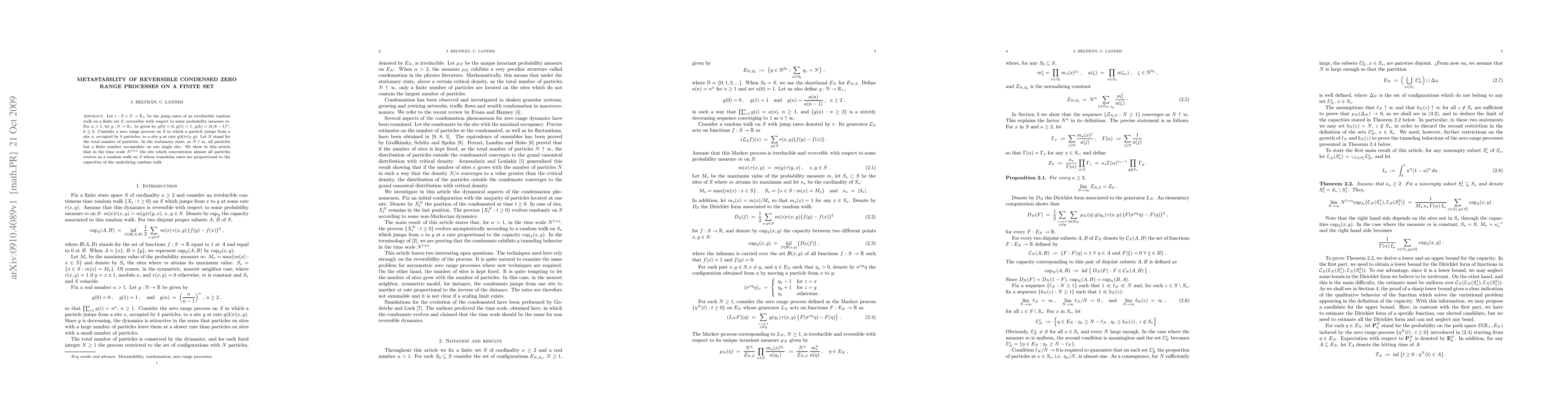 This paper investigates the metastability of reversible condensed zero range processes on a finite set, demonstrating that as the total number of particles increases, the site concentrating almost all particles behaves like a random walk with transition rates proportional to the capacities of the underlying random walk, on a time scale of $N^{1+\alpha}$.