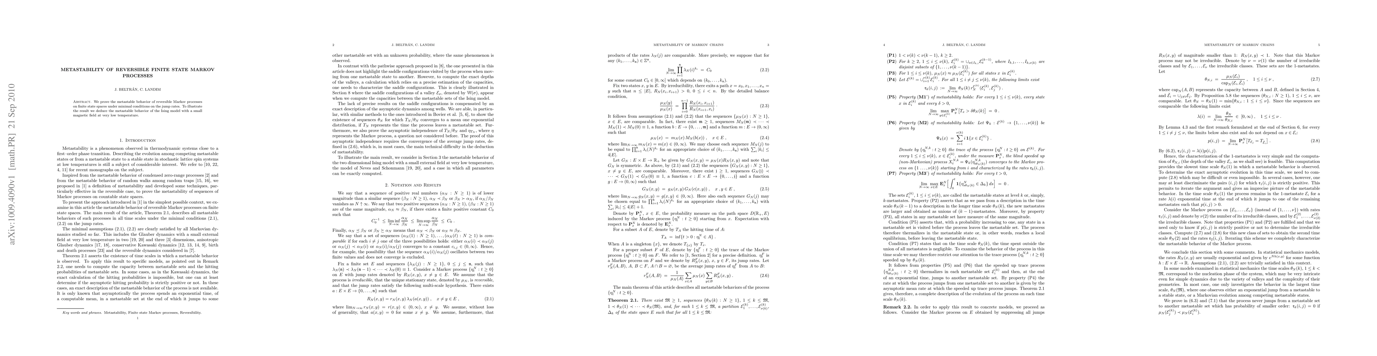 This paper proves the metastable behavior of reversible finite state Markov processes under minimal jump rate conditions, and demonstrates this with the Ising model under a small magnetic field at low temperatures.