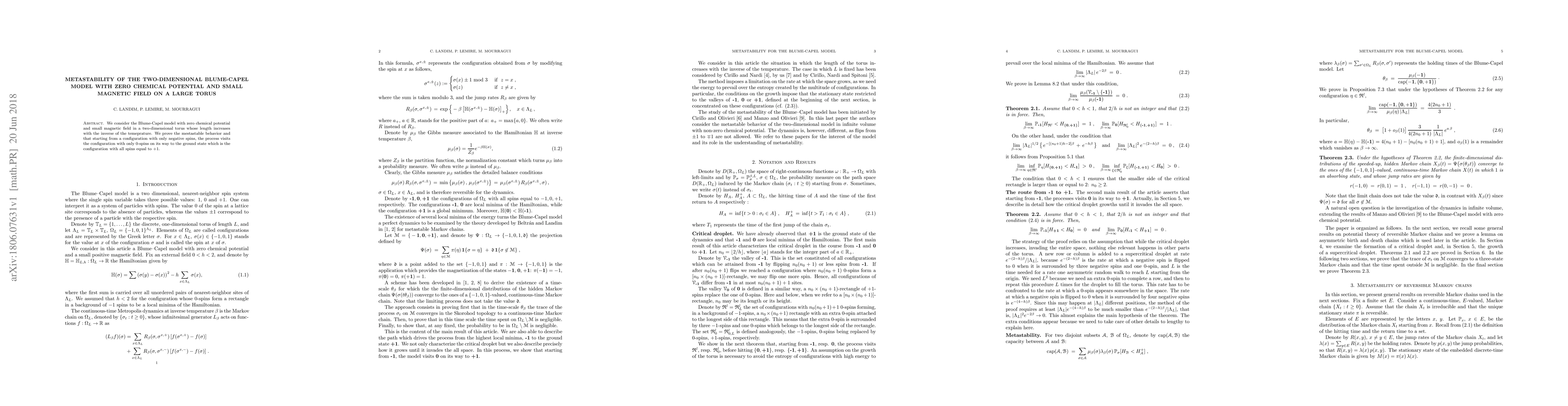 Summary: This paper investigates the metastability of the two-dimensional Blume-Capel model under zero chemical potential and a small magnetic field. It demonstrates that starting from a configuration with only negative spins, the system will visit the 0-spin configuration before reaching the ground state of all positive spins.