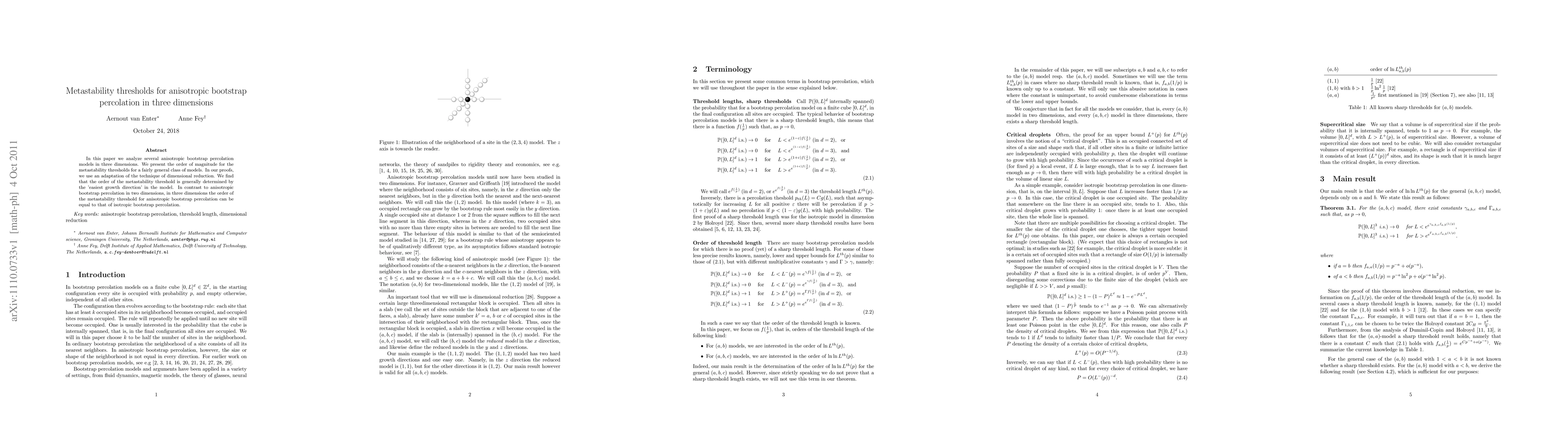 The paper analyzes anisotropic bootstrap percolation models in three dimensions using an adaptation of dimensional reduction technique.