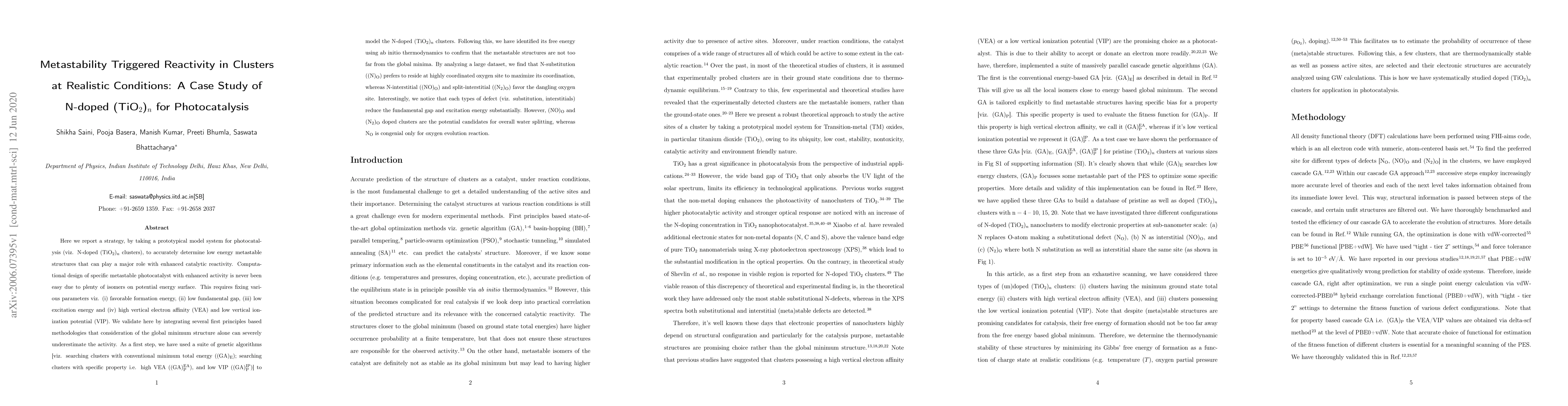 Here we report a strategy, by taking a prototypical model system for photocatalysis (viz. N-doped (TiO$_2$)$_n$ clusters), to accurately determine low energy metastable structures that can play a major role with enhanced catalytic reactivity. Computational design of specific metastable photocatalyst with enhanced activity is never been easy due to plenty of isomers on potential energy surface. This requires fixing various parameters viz. (i) favorable formation energy, (ii) low fundamental gap, (iii) low excitation energy and (iv) high vertical electron affinity (VEA) and low vertical ionization potential (VIP). We validate here by integrating several first principles based methodologies that consideration of the global minimum structure alone can severely underestimate the activity. As a first step, we have used a suite of genetic algorithms [viz. searching clusters with conventional minimum total energy ((GA)$_\textrm{E}$); searching clusters with specific property i.e. high VEA ((GA)$_\textrm{P}^{\textrm{EA}}$), and low VIP ((GA)$_\textrm{P}^{\textrm{IP}}$)] to model the N-doped (TiO$_2$)$_n$ clusters. Following this, we have identified its free energy using ab initio thermodynamics to confirm that the metastable structures are not too far from the global minima. By analyzing a large dataset, we find that N-substitution ((N)$_\textrm{O}$) prefers to reside at highly coordinated oxygen site to maximize its coordination, whereas N-interstitial ((NO)$_\textrm{O}$) and split-interstitial ((N$_2)_\textrm{O}$) favor the dangling oxygen site. Interestingly, we notice that each types of defect (viz. substitution, interstitials) reduce the fundamental gap and excitation energy substantially. However, (NO)$_\textrm{O}$ and (N$_2)_\textrm{O}$ doped clusters are the potential candidates for overall water splitting, whereas N$_\textrm{O}$ is congenial only for oxygen evolution reaction.