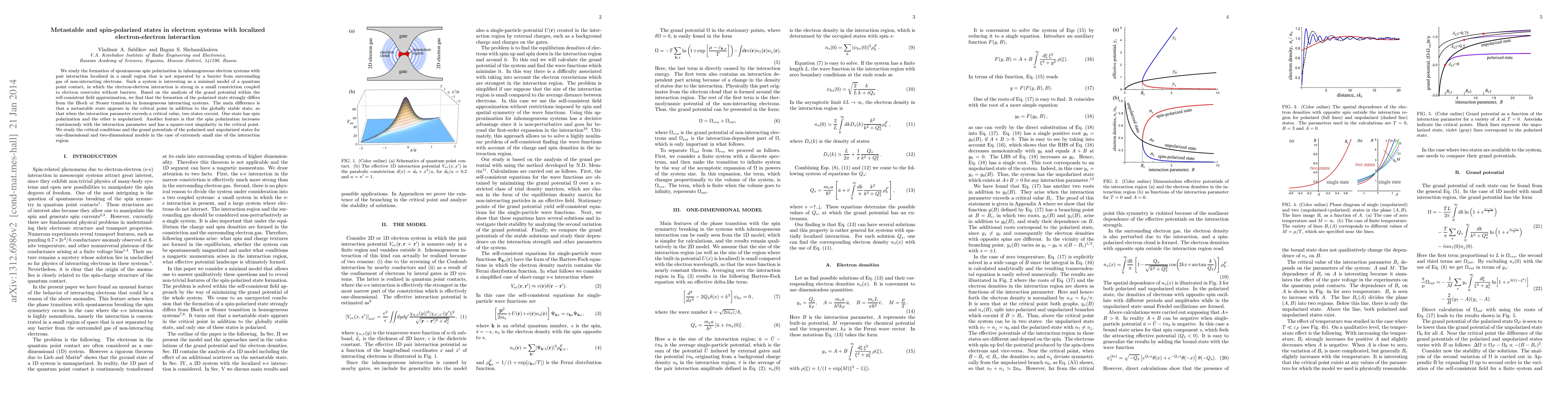 We study the formation of spontaneous spin polarization in inhomogeneous electron systems with pair interaction localized in a small region that is not separated by a barrier from surrounding gas of non-interacting electrons. Such a system is interesting as a minimal model of a quantum point contact, in which the electron-electron interaction is strong in a small constriction coupled to electron reservoirs without barriers. Based on the analysis of the grand potential within the self-consistent field approximation, we find that the formation of the polarized state strongly differs from the Bloch or Stoner transition in homogeneous interacting systems. The main difference is that a metastable state appears in the critical point in addition to the globally stable state, so that when the interaction parameter exceeds a critical value, two states coexist. One state has spin polarization and the other is unpolarized. Another feature is that the spin polarization increases continuously with the interaction parameter and has a square-root singularity in the critical point. We study the critical conditions and the grand potentials of the polarized and unpolarized states for one-dimensional and two-dimensional models in the case of extremely small size of the interaction region.