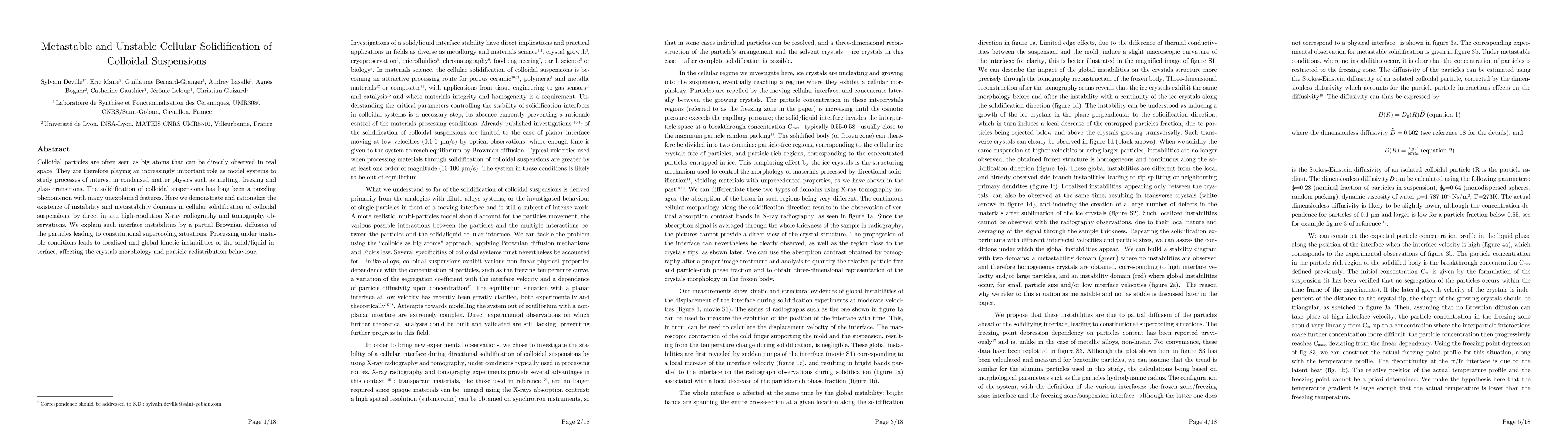 This paper explores the solidification of colloidal suspensions, revealing instability and metastability domains through high-resolution X-ray radiography and tomography. The study explains interface instabilities due to partial Brownian diffusion, leading to kinetic instabilities that affect crystal morphology and particle redistribution.
