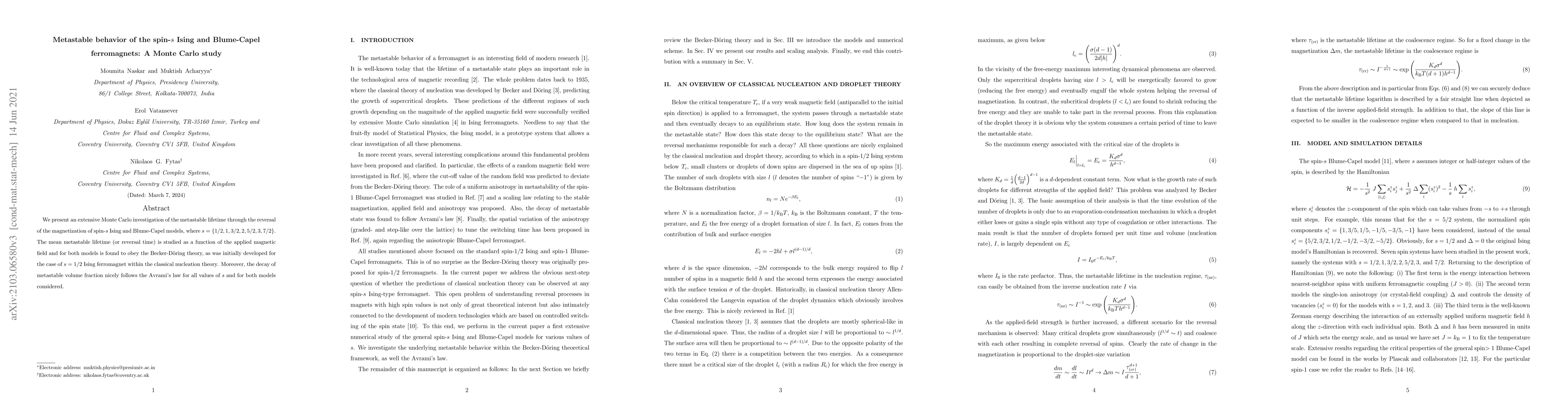 This paper uses Monte Carlo simulations to study the metastable lifetime in spin-$s$ Ising and Blume-Capel ferromagnets, finding that the mean metastable lifetime follows the Becker-Doring theory and the decay of metastable volume fraction adheres to Avrami's law for all spin values.