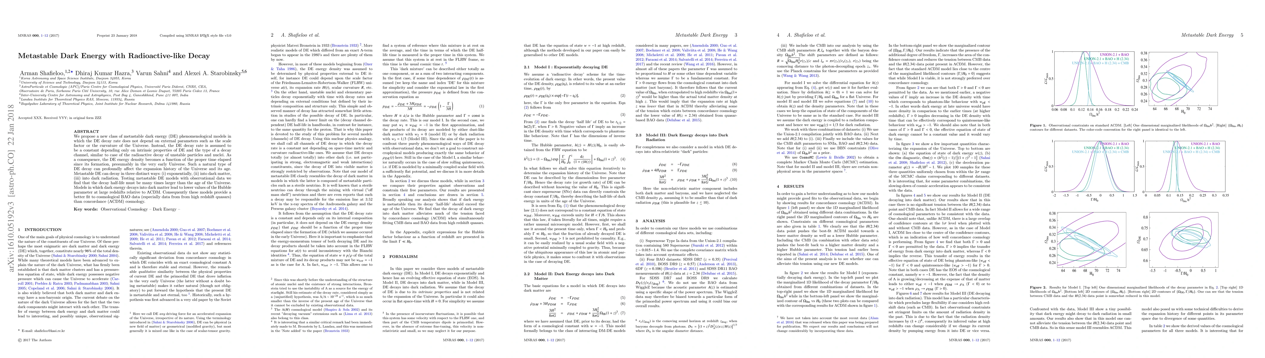 This paper proposes metastable dark energy models where the decay rate is constant and intrinsic, akin to radioactive decay, affecting the Universe's expansion history. Models suggest the decay half-life must exceed the Universe's age, with dark energy decaying into dark matter or radiation, potentially offering better fits to BAO data than the standard ΛCDM model.