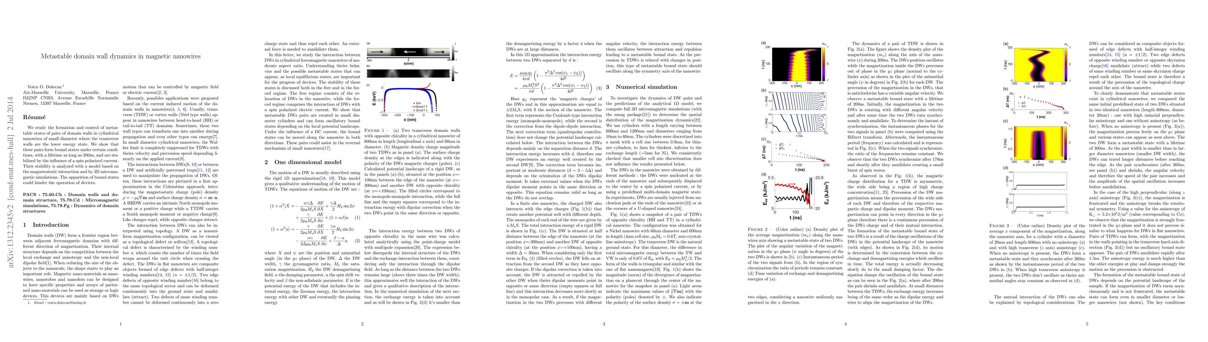 Researchers studied metastable domain wall pairs in magnetic nanowires, finding they can form stable bound states lasting up to 200ns, stabilized by spin-polarized currents.